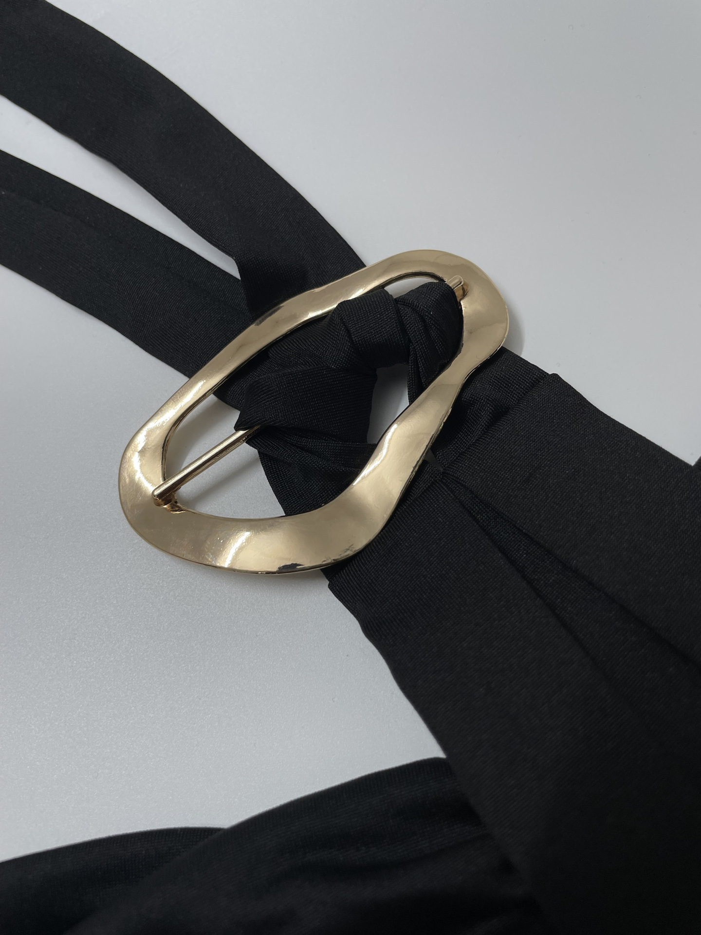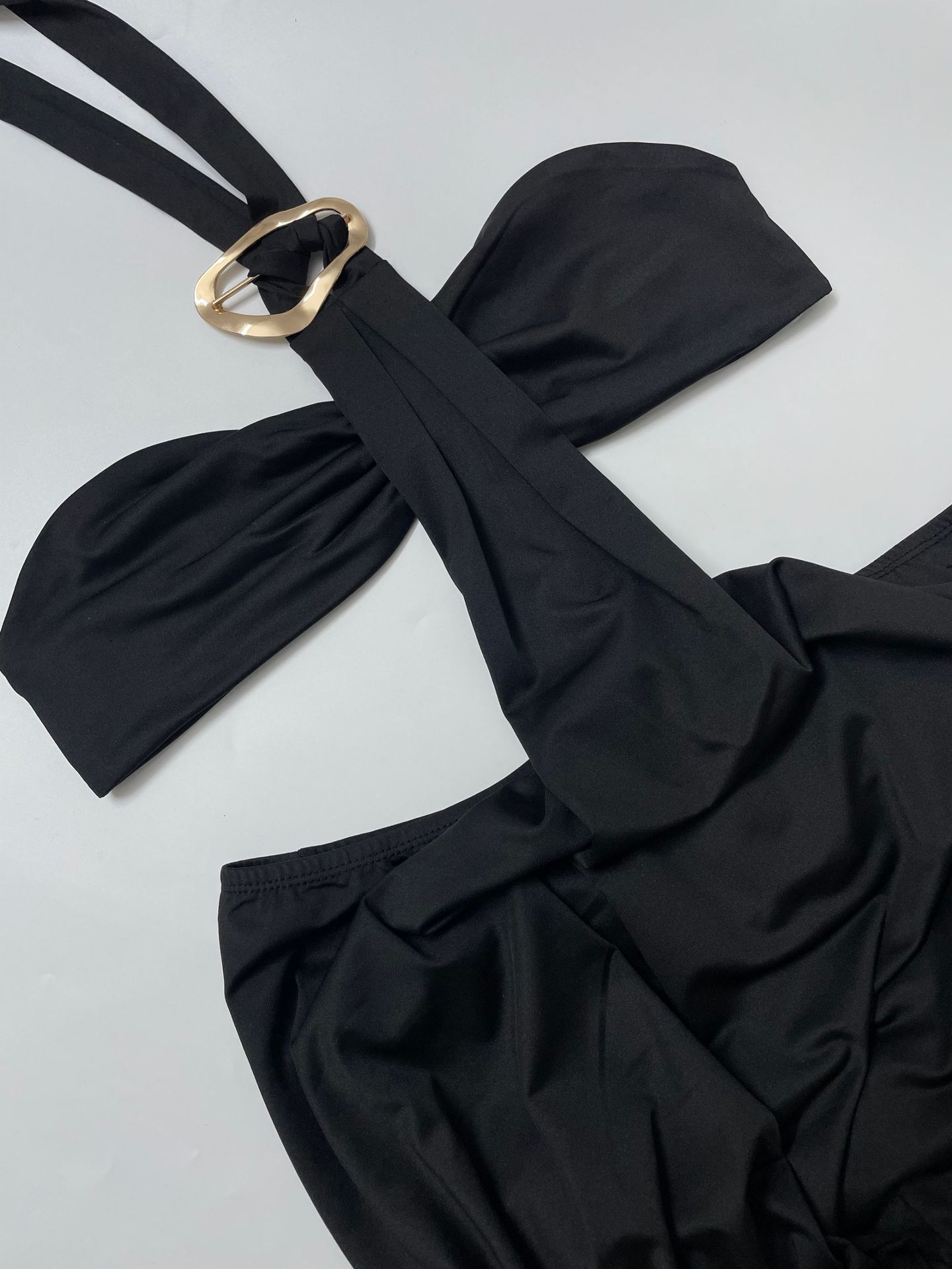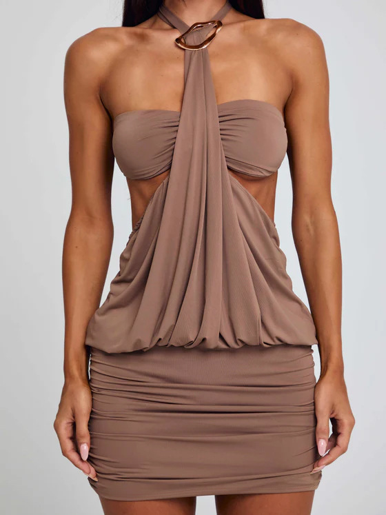 Trendy elements: Solid color, metallic accents, off-shoulder, open-back