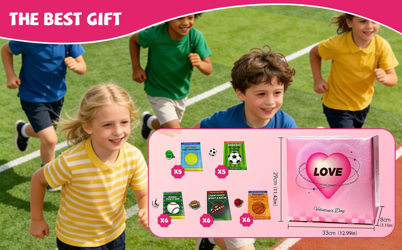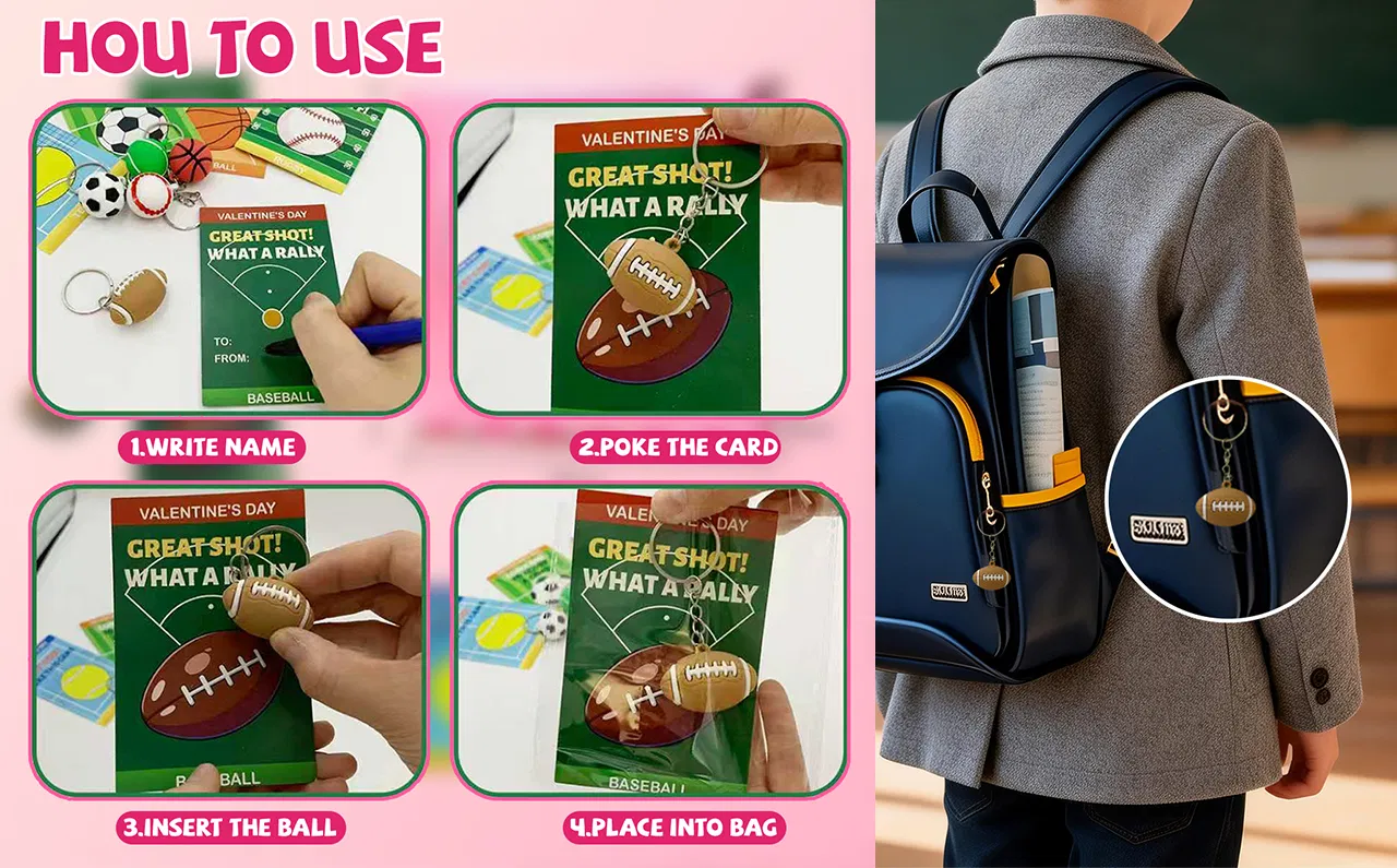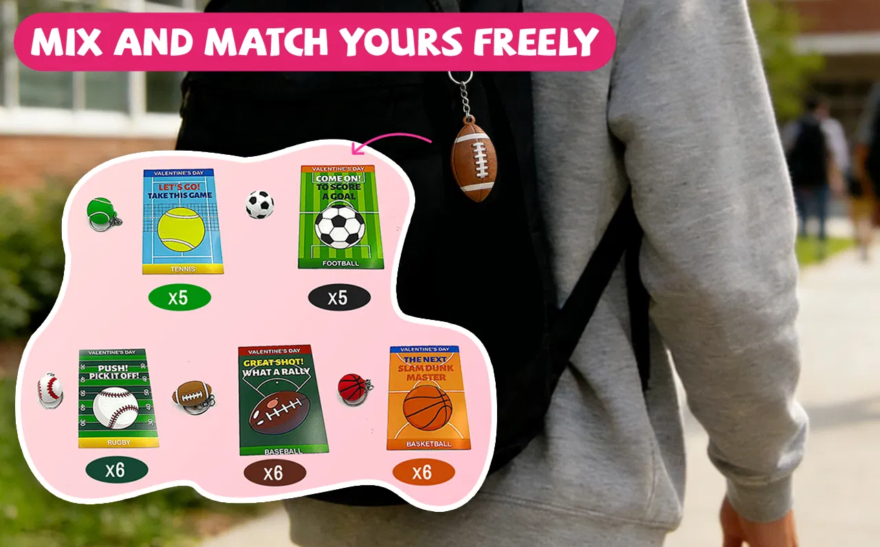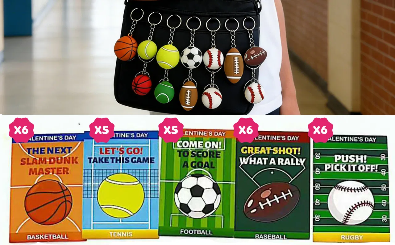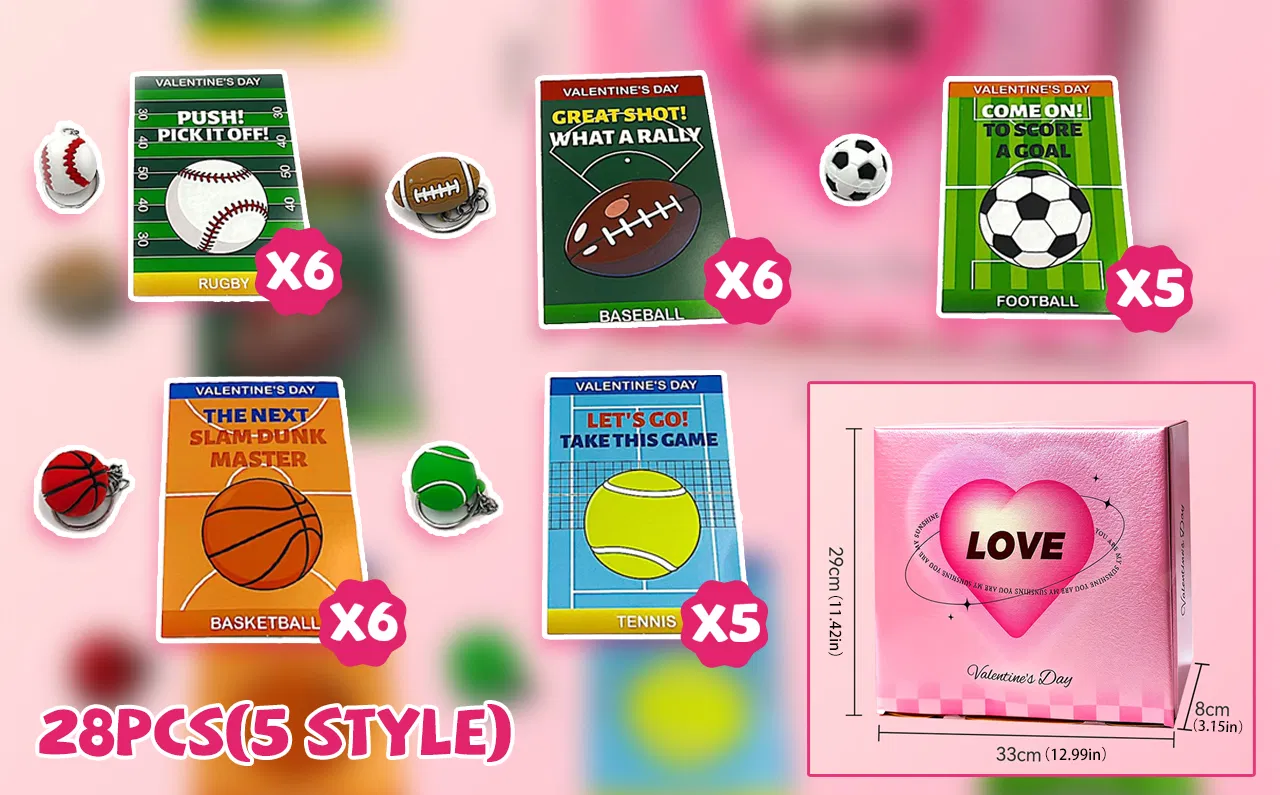Valentine’s Day Keychain & Card Set – 28 mini stress ball keychains (4 footballs; 6 each of soccer, basketball, tennis, and baseball) and 28 matching Valentine’s Day cards. Perfect for classroom exchanges, Valentine’s gifts.Mini Stress Ball Keychains – Made from soft, durable PU material. Sizes: Soccer, Basketball, Tennis, Baseball approx. 1.2 in ; Football 1 × 1.5 in . Great for stress relief, keychains, or bag charms.Sports-Themed Valentine Cards – Each card features a sports ball design (3.2 × 4.5 in ) with space for personal messages. Perfect for school classmate exchanges or Valentine’s treats.Perfect for Classroom & Kids' Parties: A fun, non-candy gift option for children in 3rd, 4th, and 5th grades, as well as adults who love sports. Great for gift exchanges, parties, or small prizes.High-Quality & Safe: Cards are printed on sturdy cardstock, and the stress balls are made from safe, kid-friendly materials—ideal for classroom fun and school goodie bags.