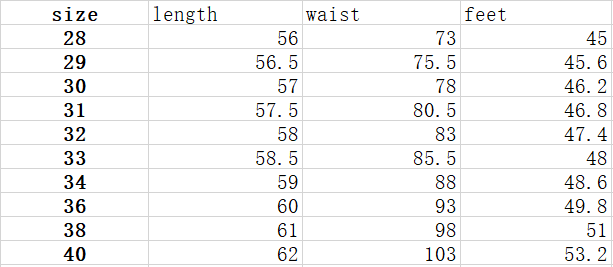 Size: 28 (2 feet 1), 29 (2 feet 2), 30 (2 feet 3), 31 (2 feet 4), 32 (2 feet 5), 33 (2 feet 6), 34 (2 feet 7) , 36 (2 feet 9), 38 (3 feet 1), 40 (3 feet 4)