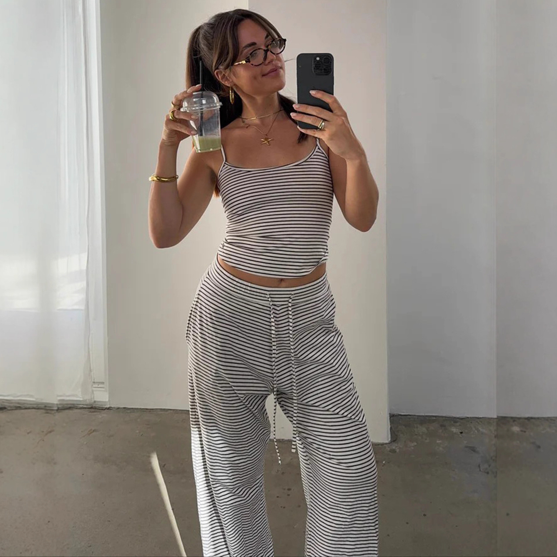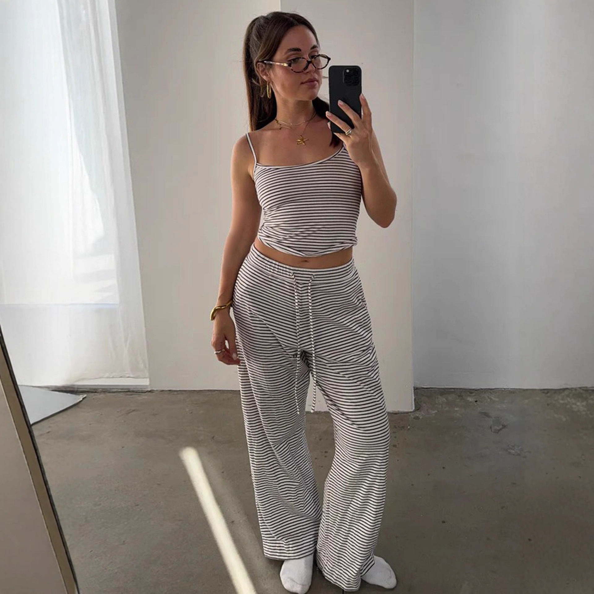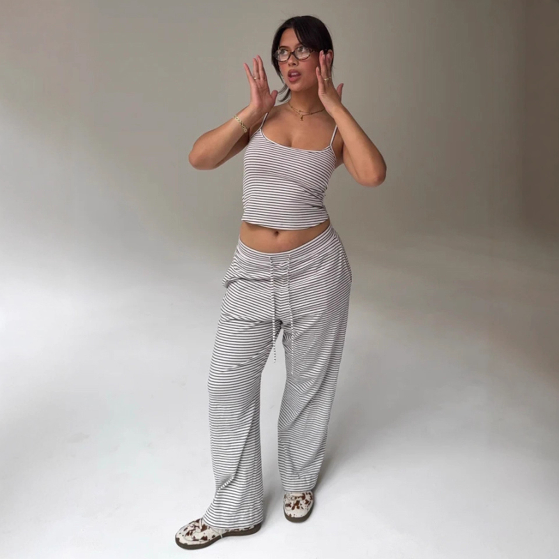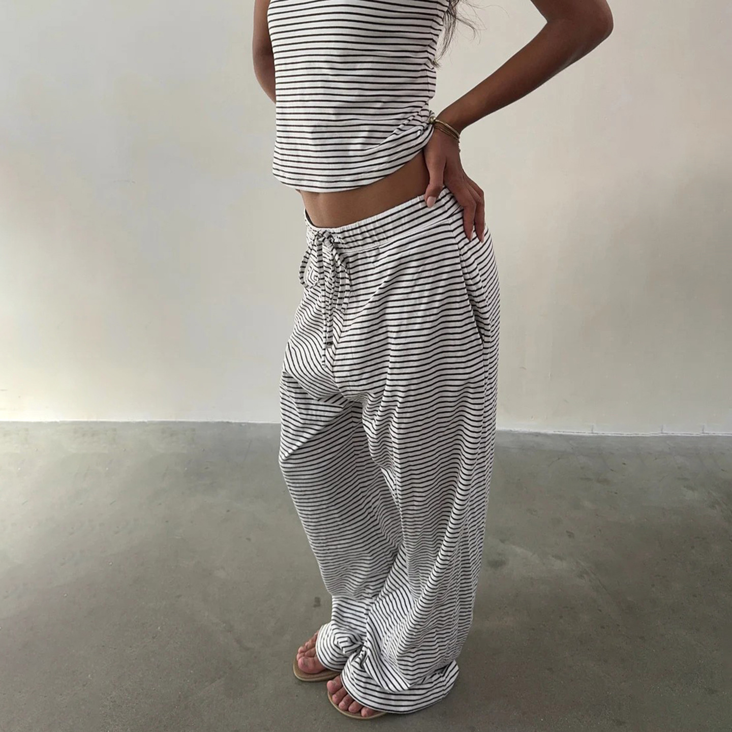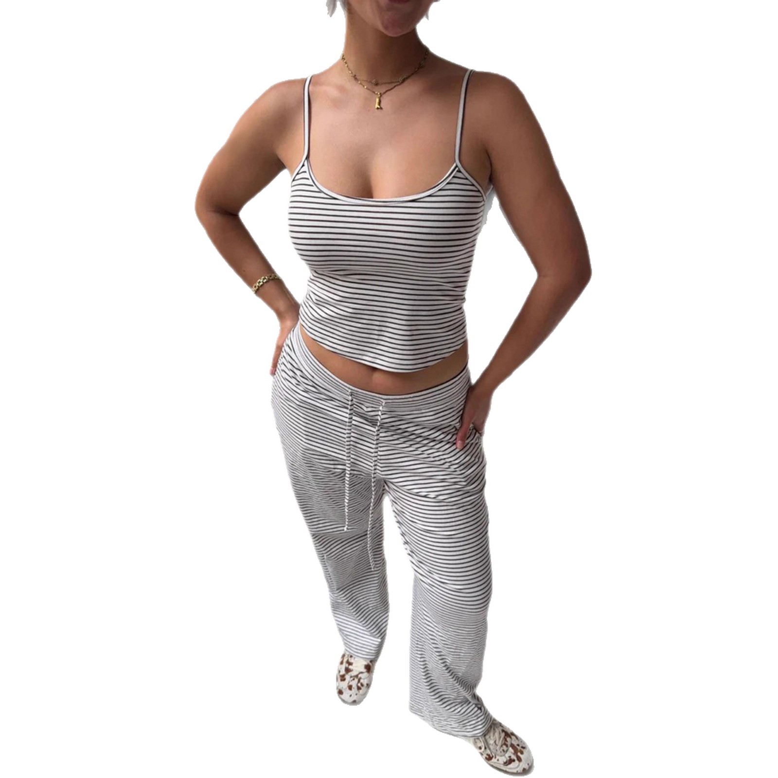 Striped Camisole Top And Elastic-waist Pants Loungewearpajama Two-piece Set