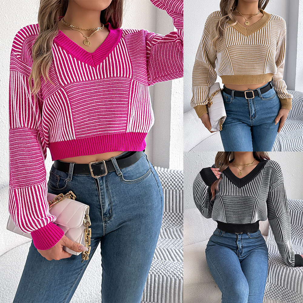 Striped Lantern Sleeve Pullover Midriff-baring Sweater Women's Clothing