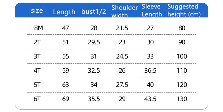 Suitable height: 18M(80), 2T(90), 3T(100), 4T(110), 5T(120), 6T(130)