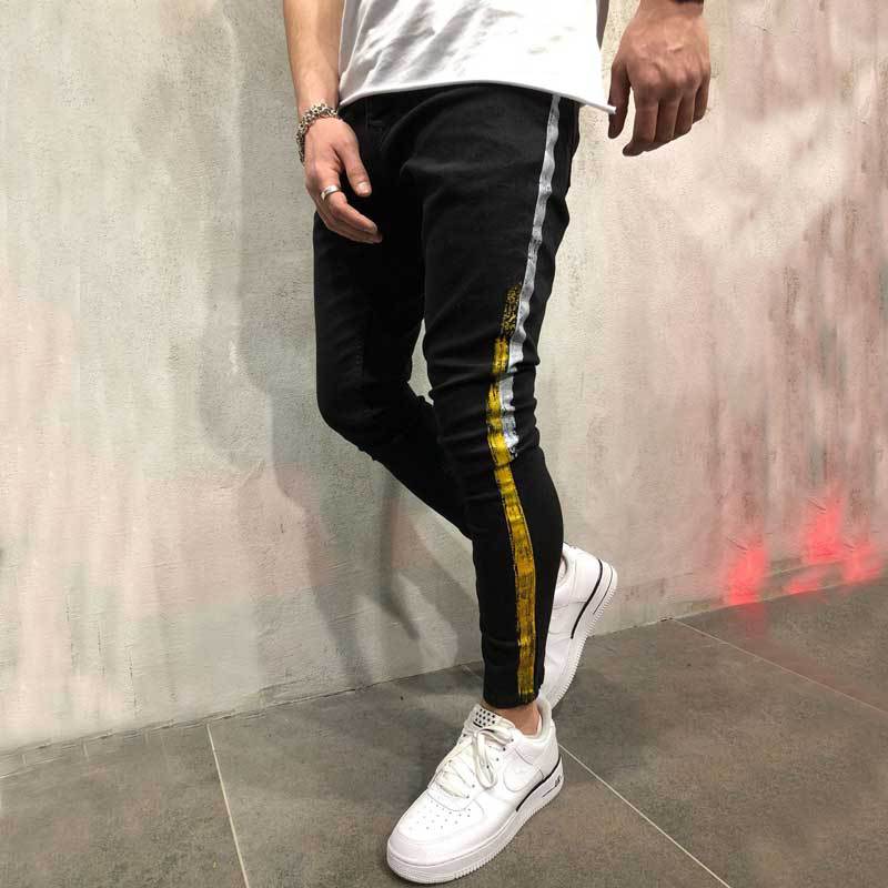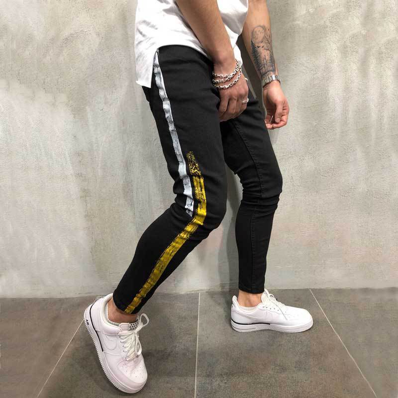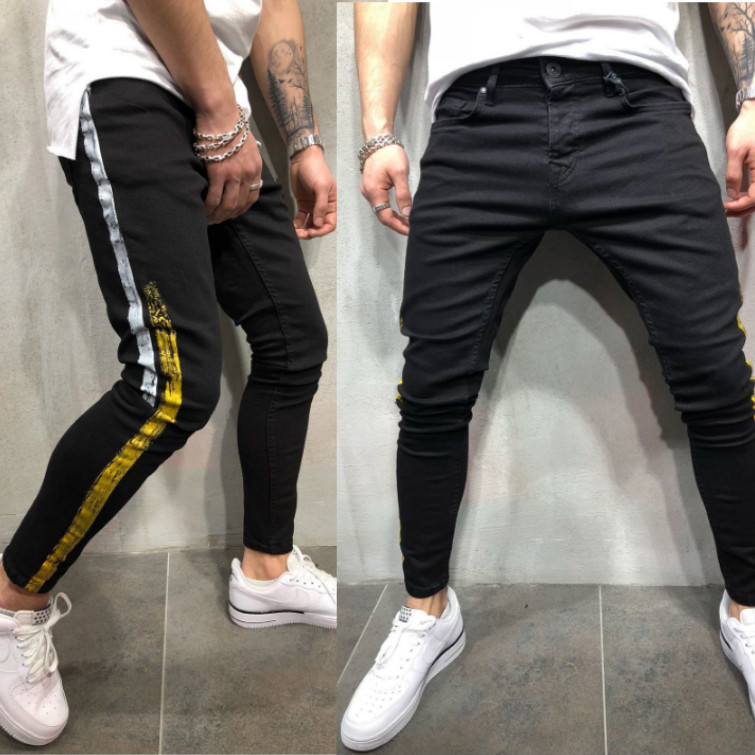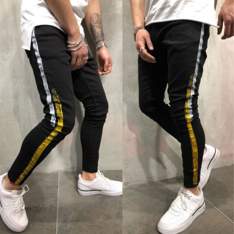 Striped printed denim slim legged black pants