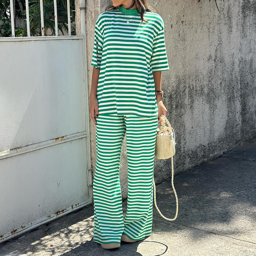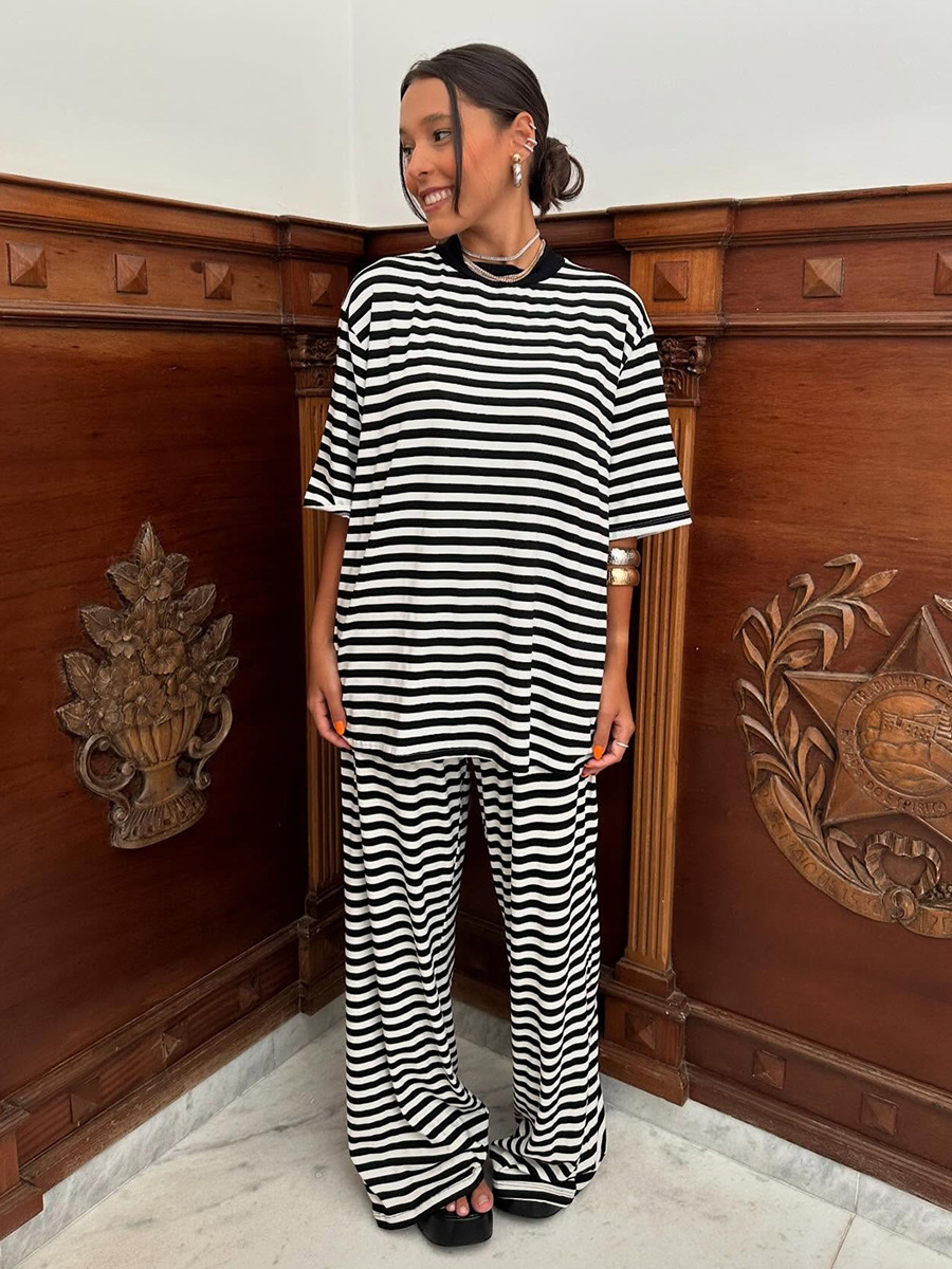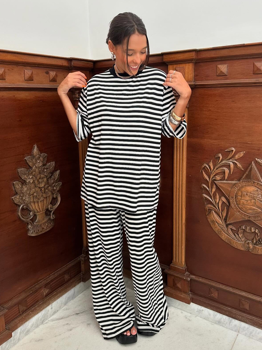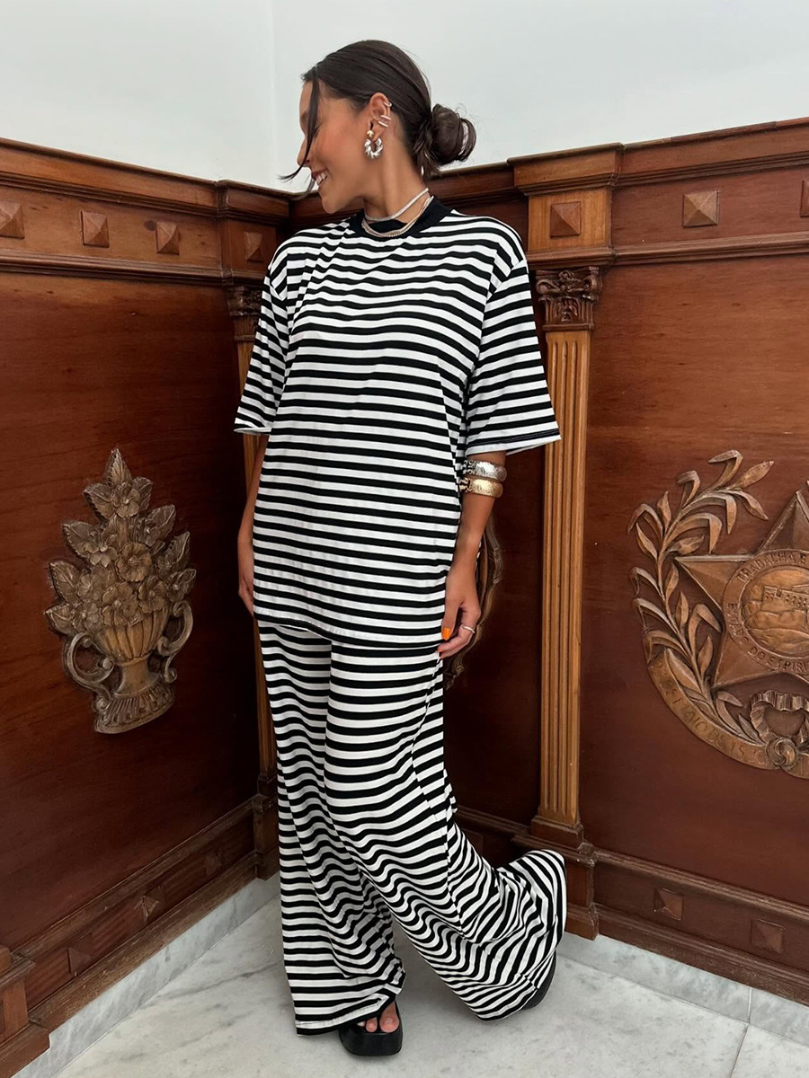 Striped Short Sleeved Long Pants Two-piece Set