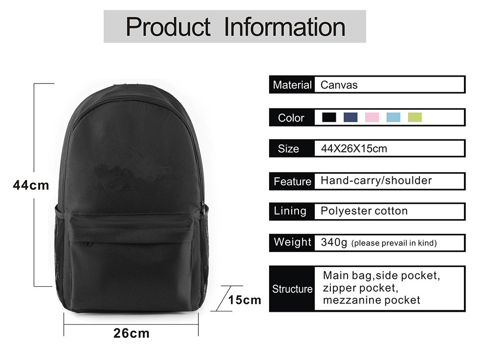 Structure: Main bag, side pocket, zipper pocket, mezzanine pocket