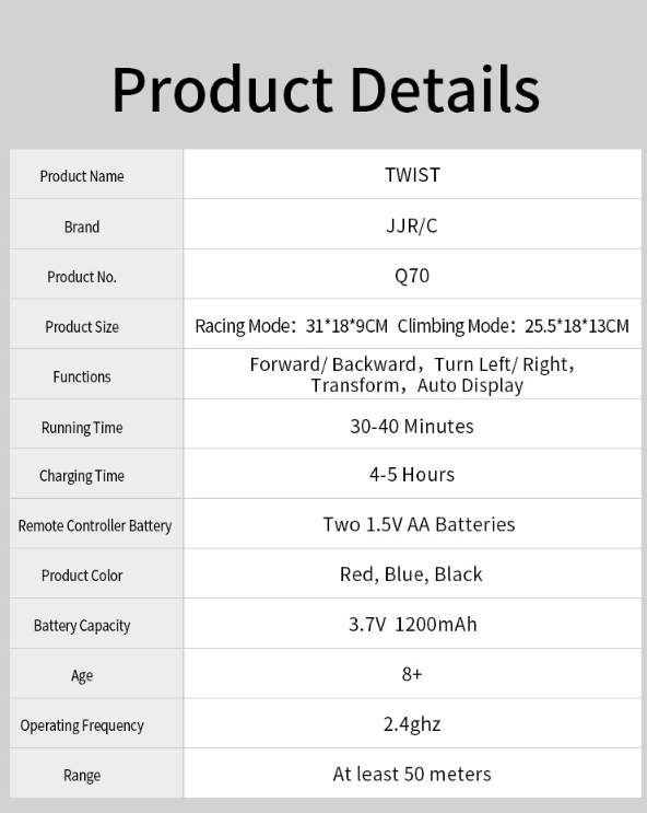 Function: Forward Back Left turn Right turn, twist, automatically demonstrate new energy lithium battery. Longer battery life, four driving forces, twisting, flipping on both sides