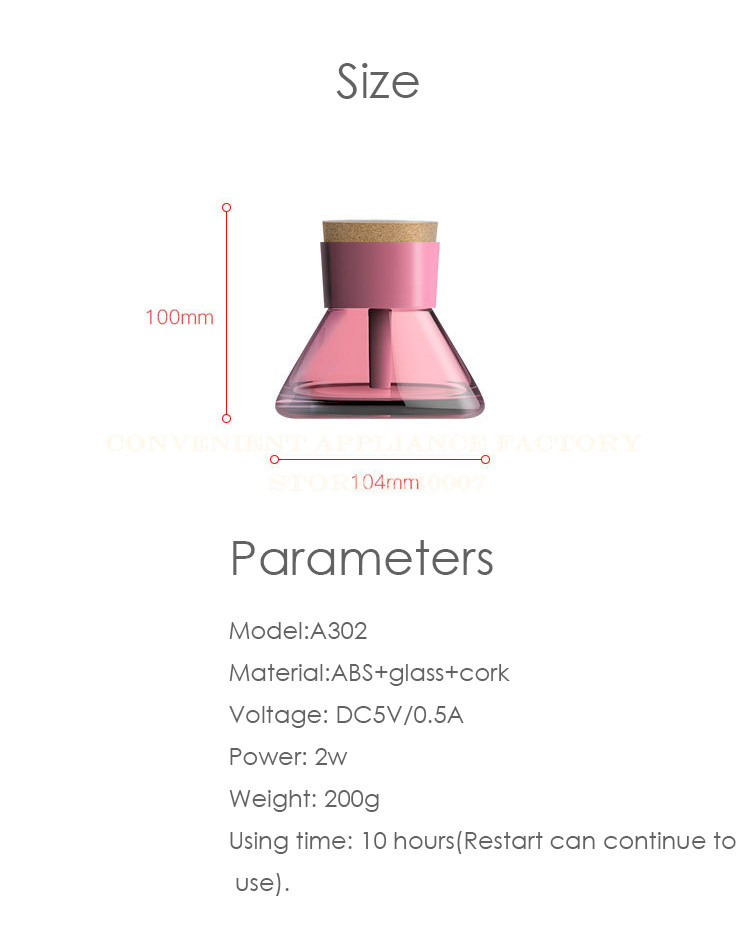 Material: ABS plastic / glass / corkCapacity: 200mlInput: DC5V / 0.5A.Power: 2WUse time: 10 hours