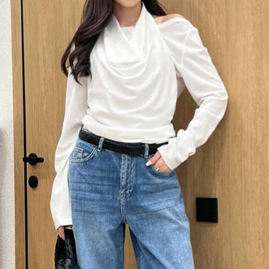 Stylish Halter-Neck Long-Sleeve White T-Shirt For Women
