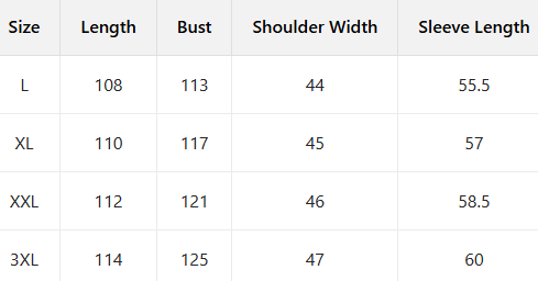 Sizes: M, L, XL, 2XL, 3XL