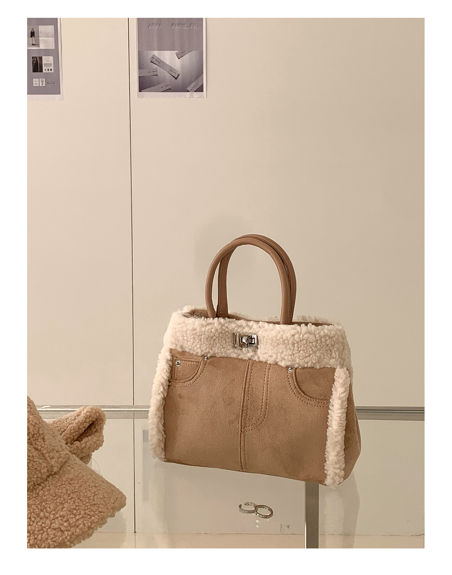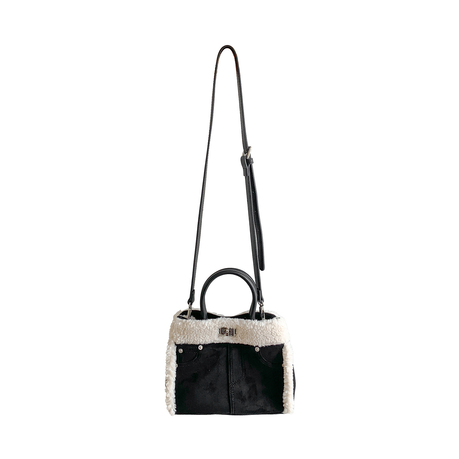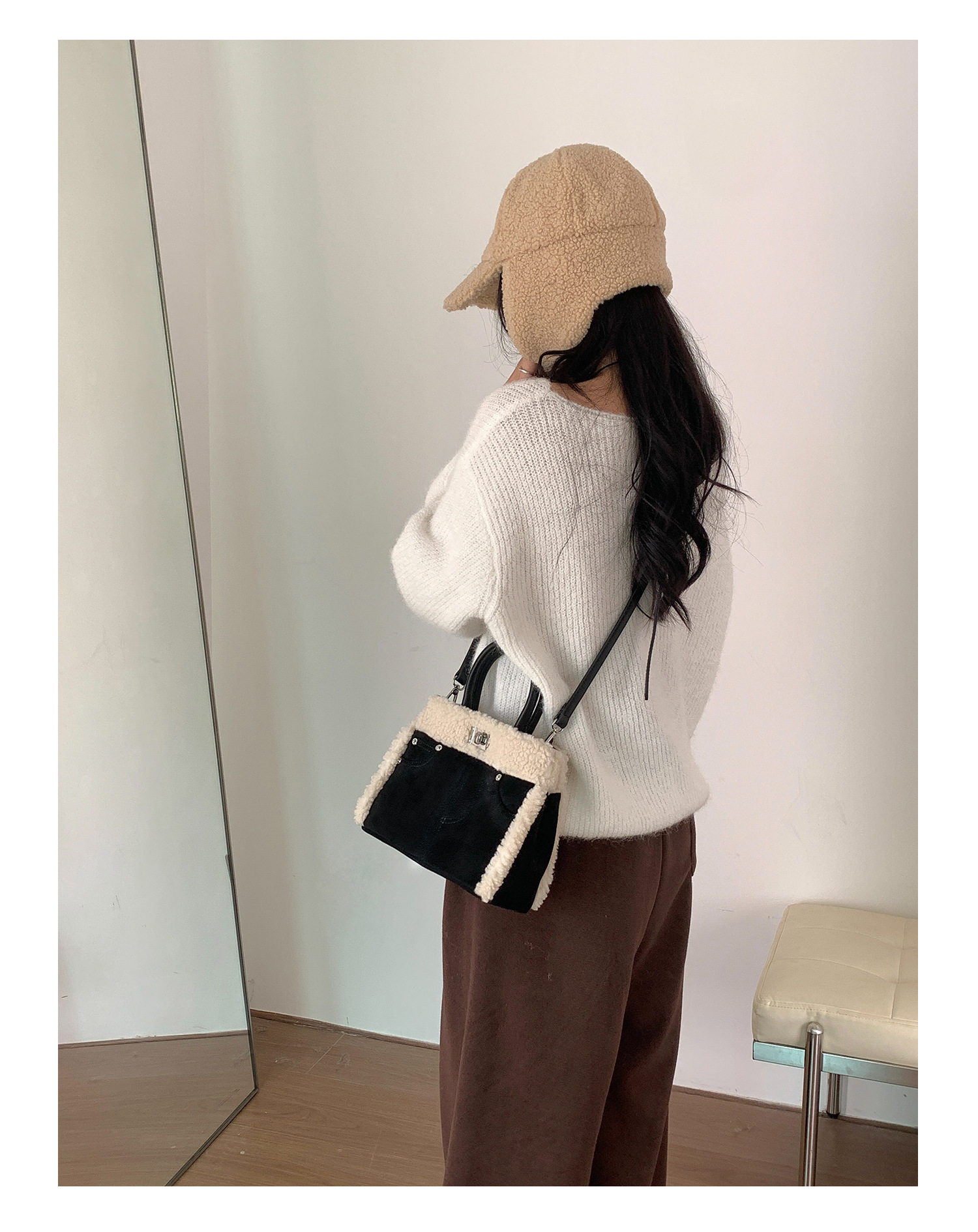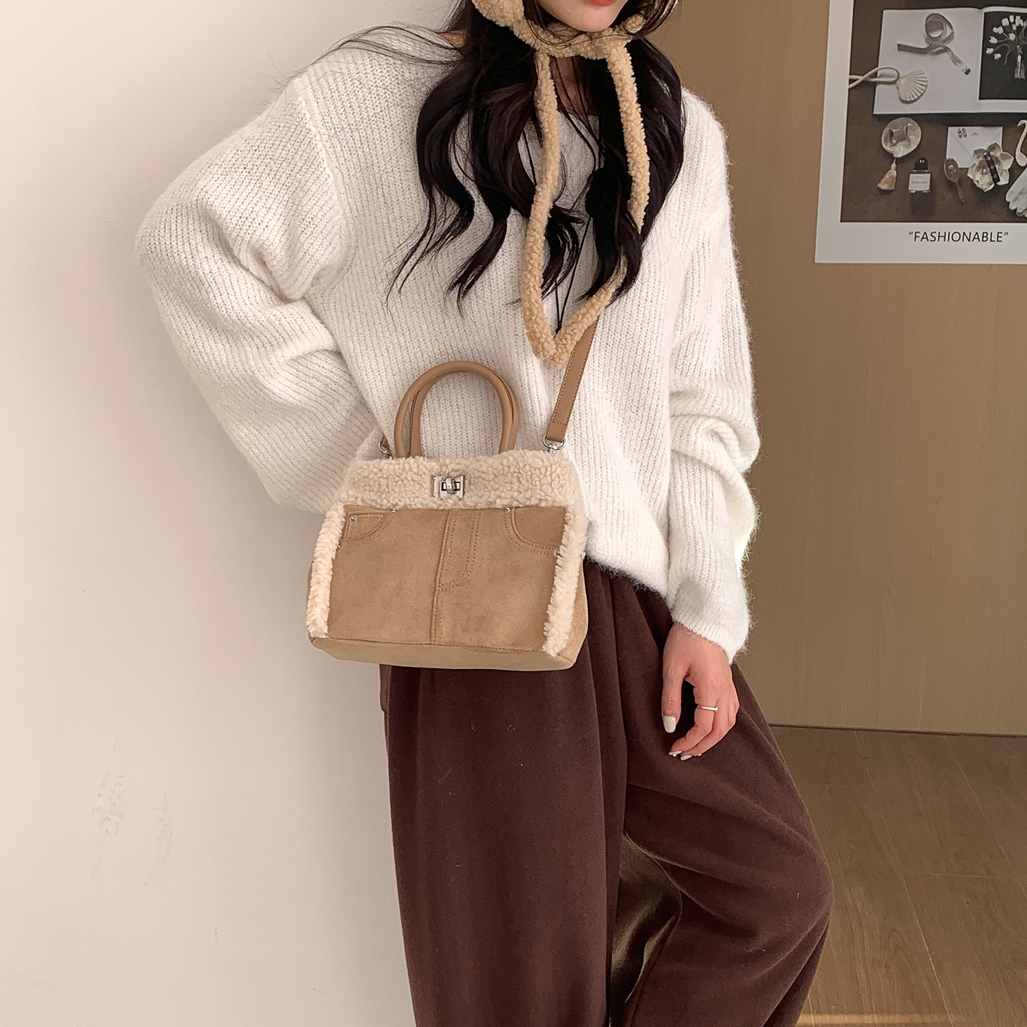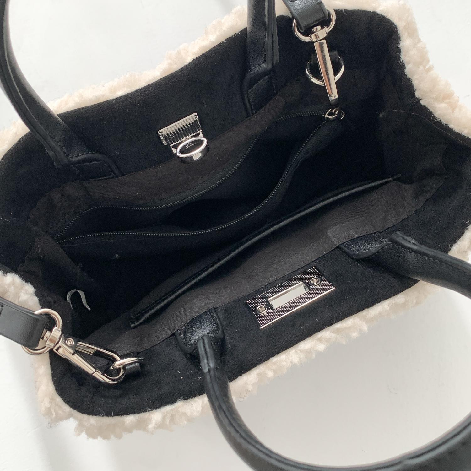 Trendy elements: solid color, plush, stitching, patchwork, clasp