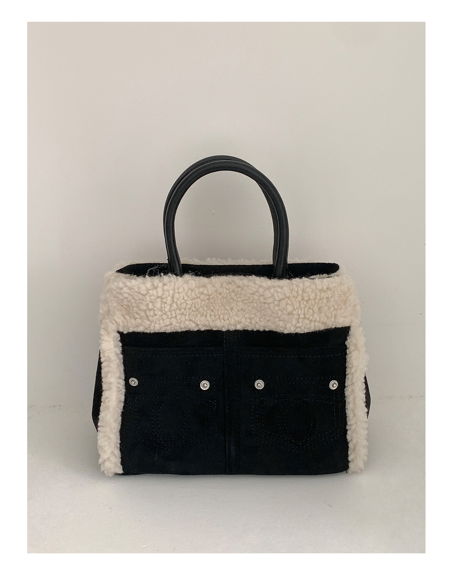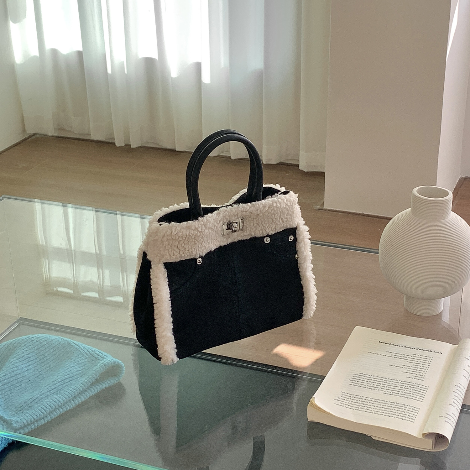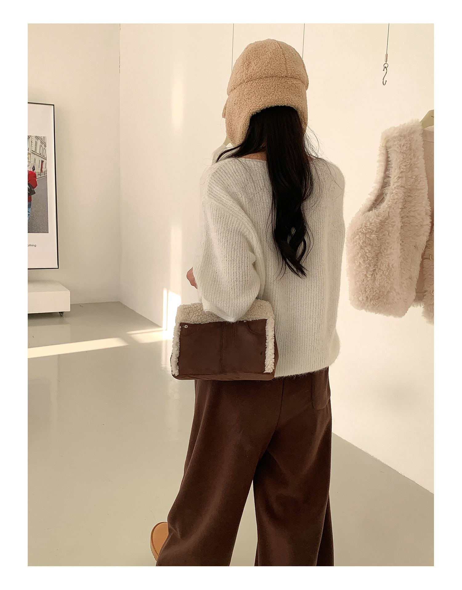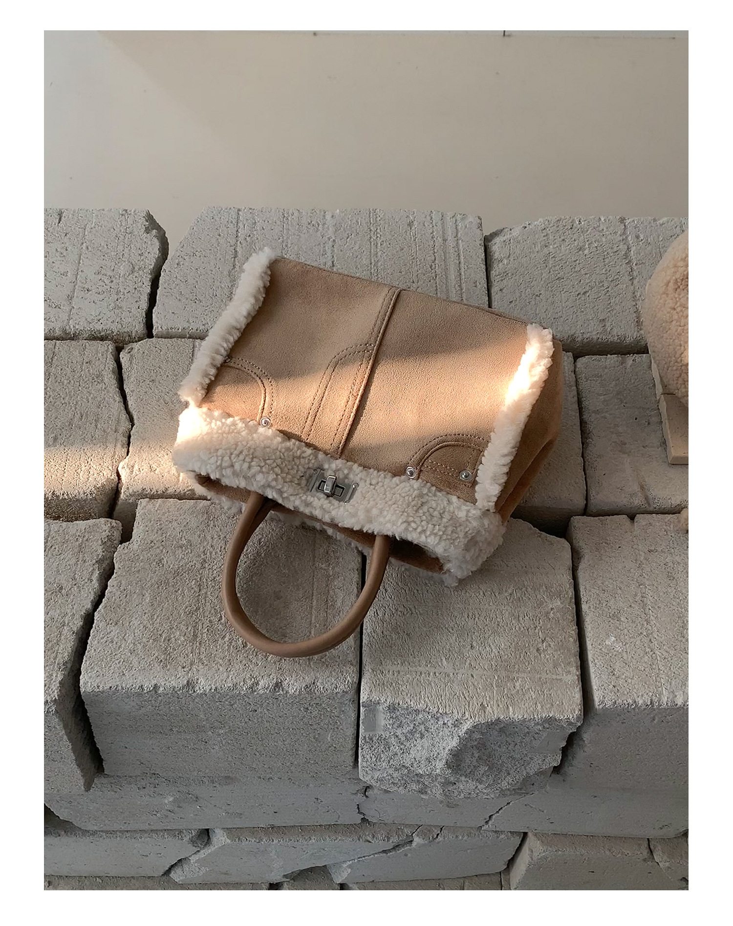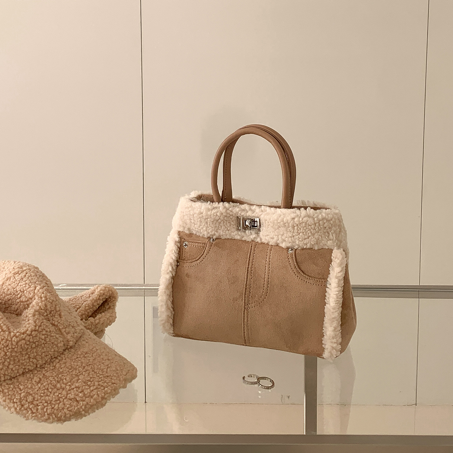 Trendy elements: solid color, plush, stitching, patchwork, clasp