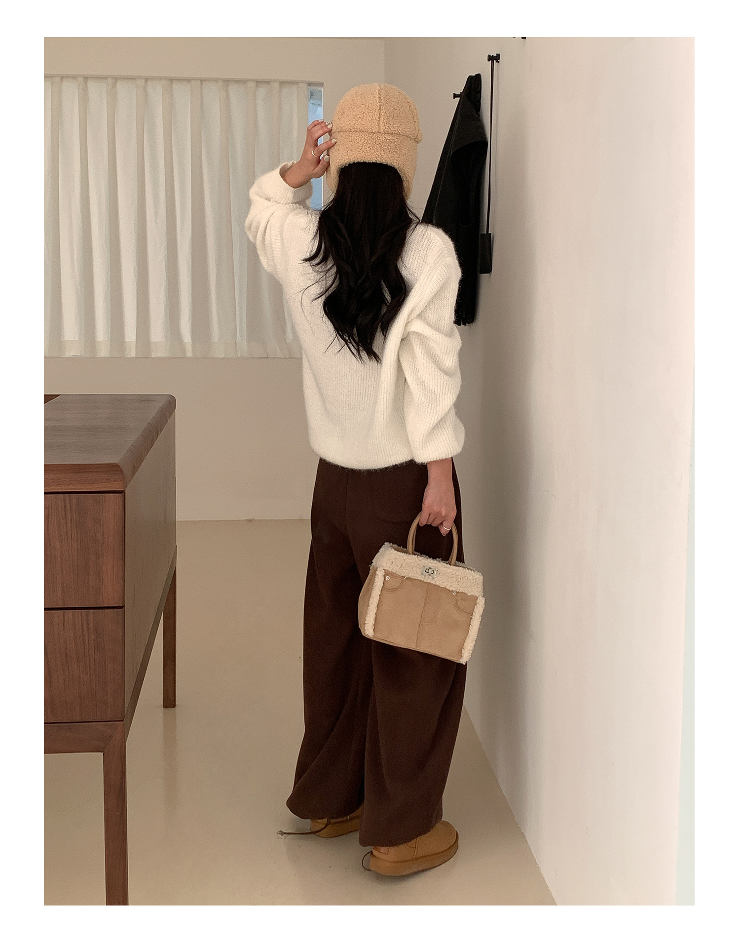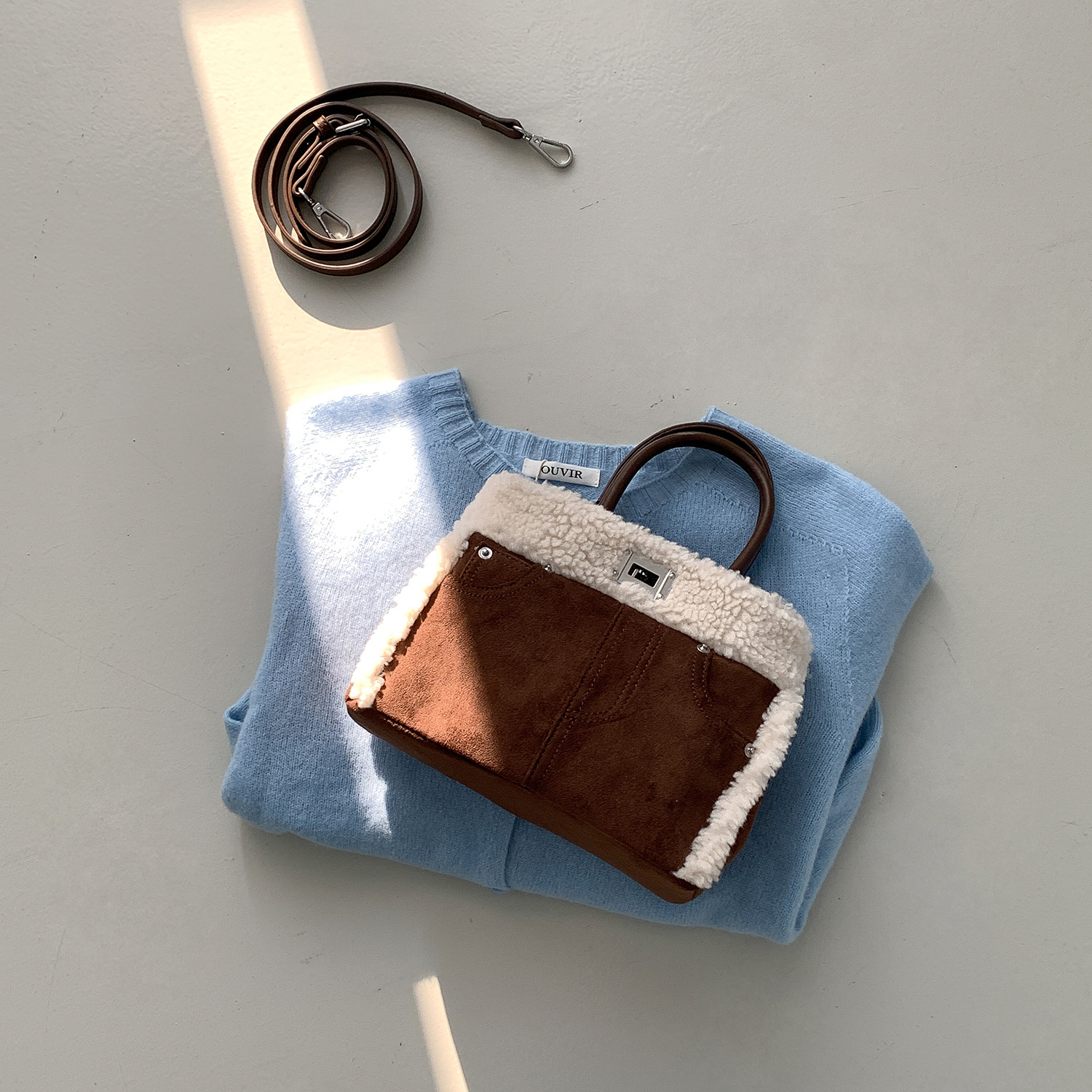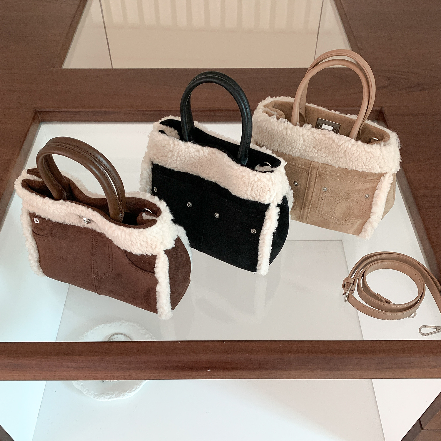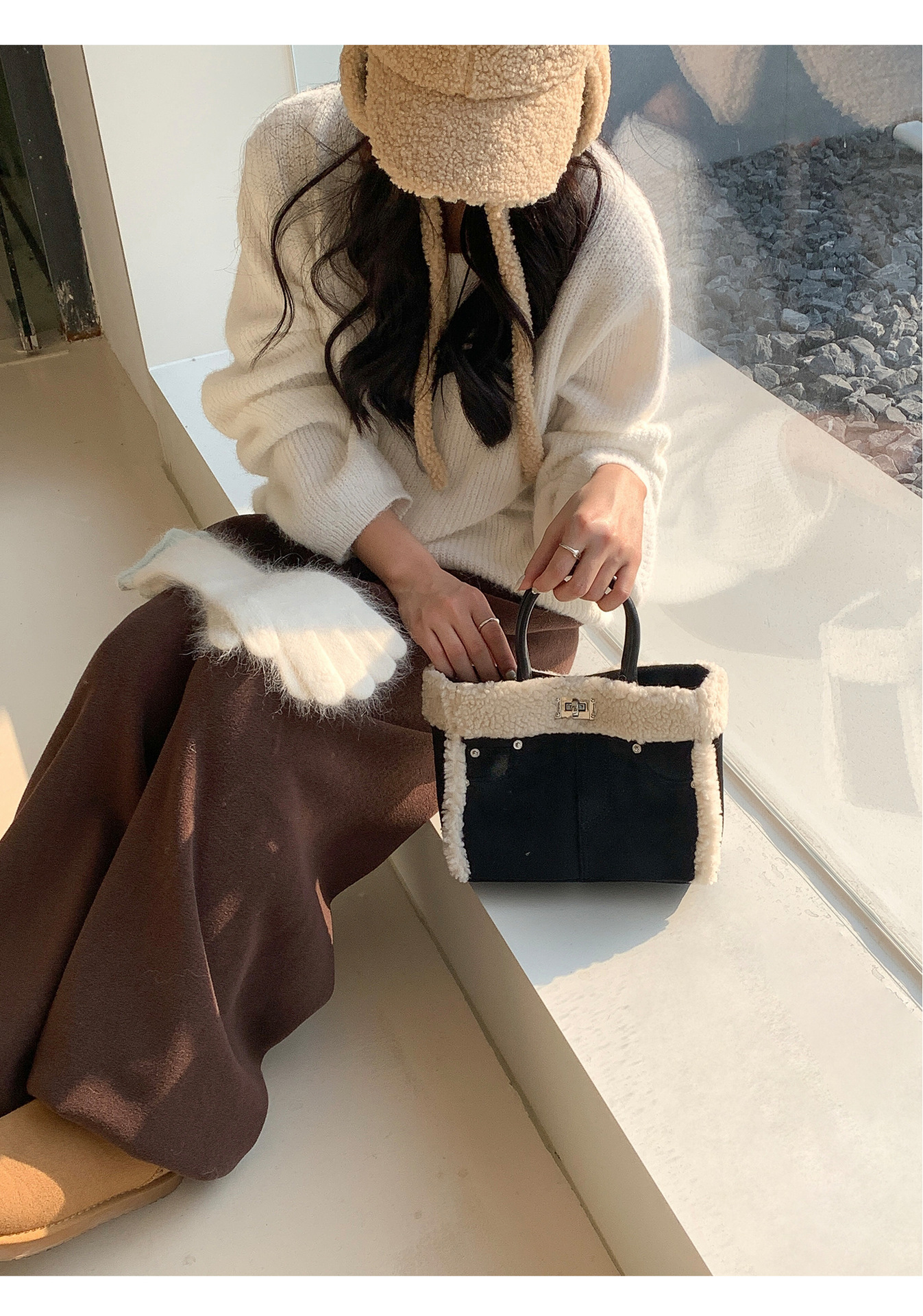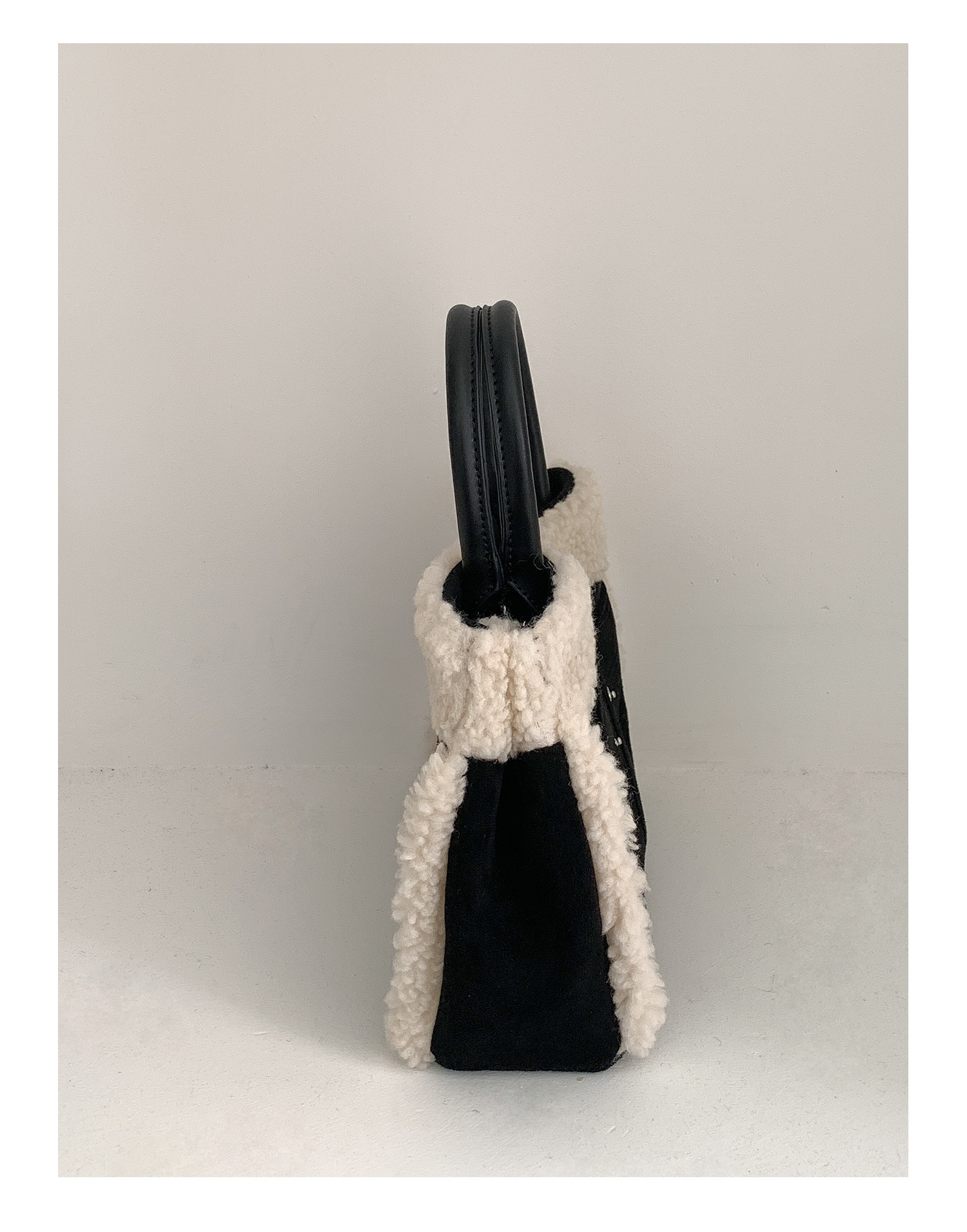 Trendy elements: solid color, plush, stitching, patchwork, clasp
