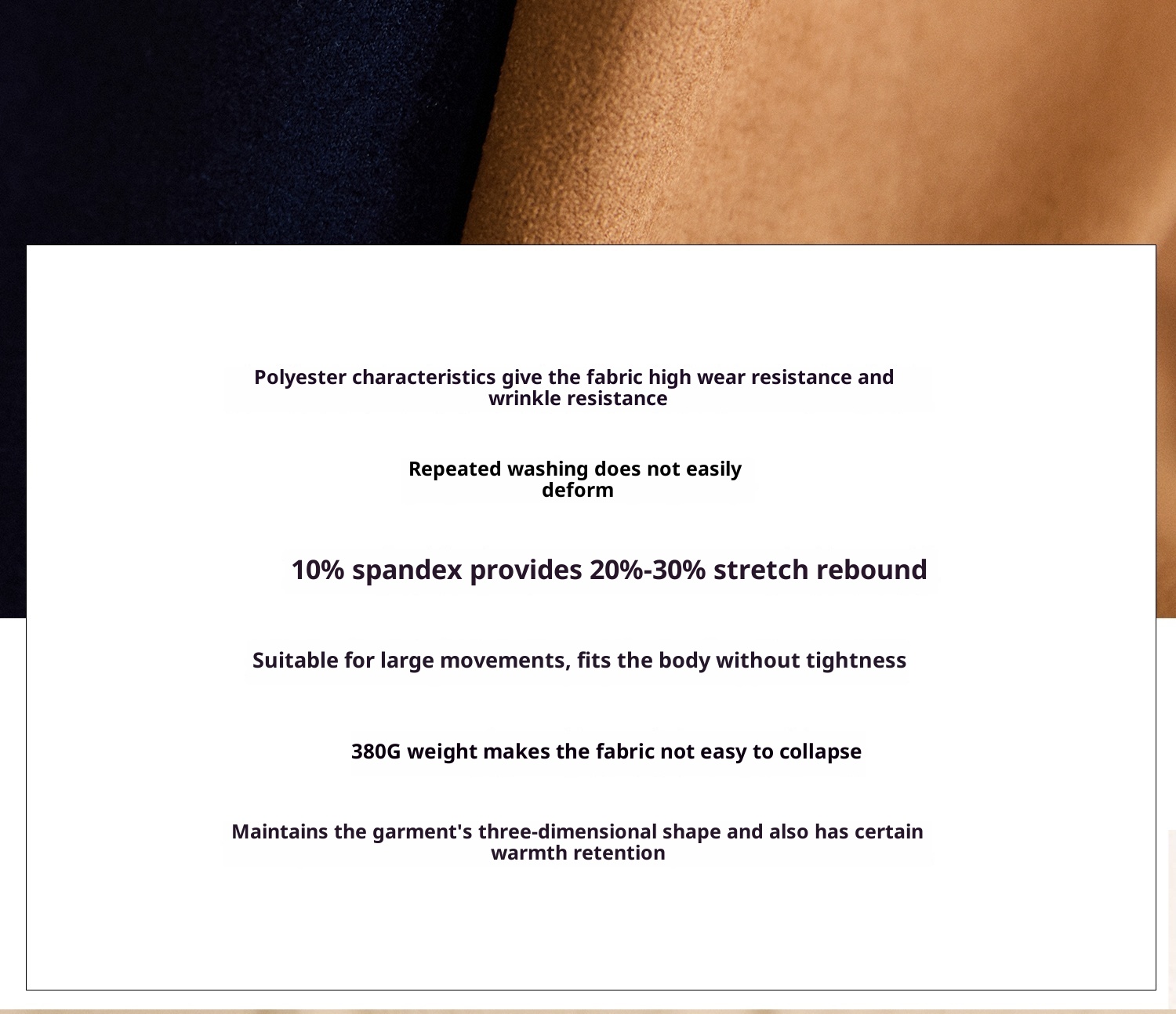 Material composition: polyethylene terephthalate (polyester) 90% polycarbaminate fiber (spandex) 10%