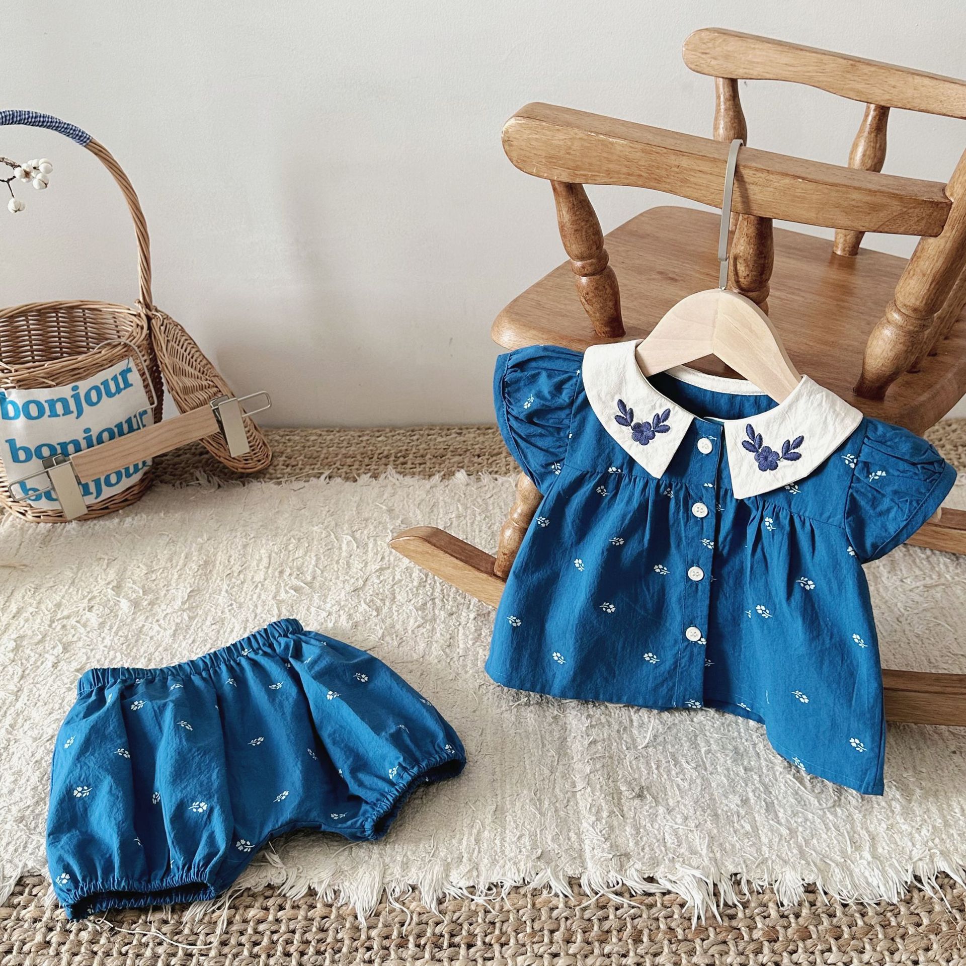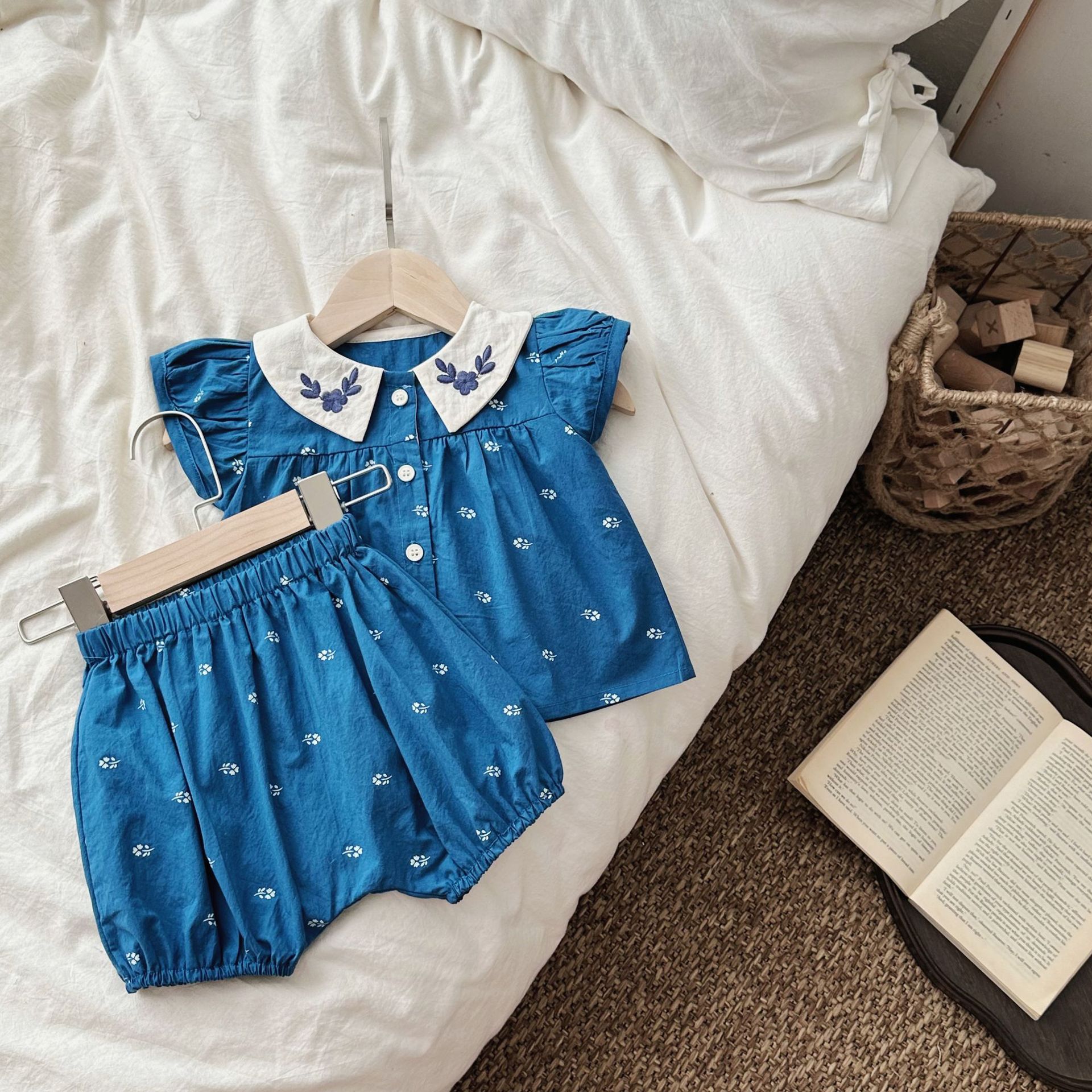 Color: Lake blue floral embroidered neckline puff short sleeve cardigan shorts