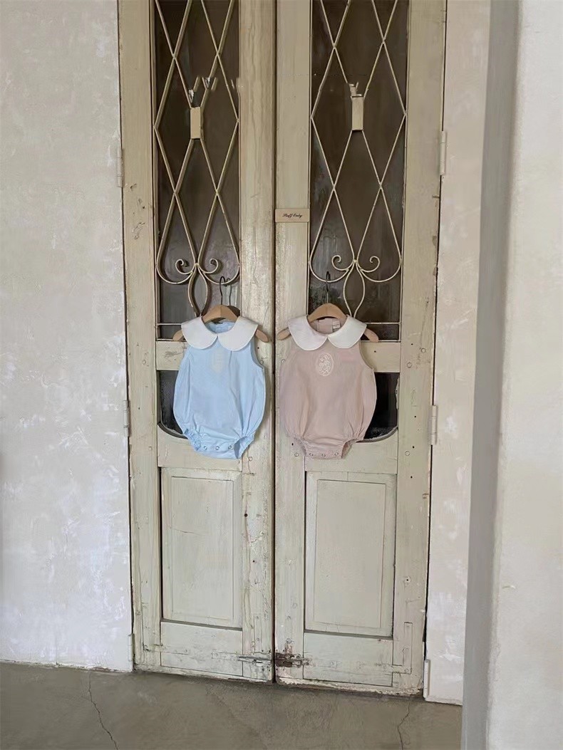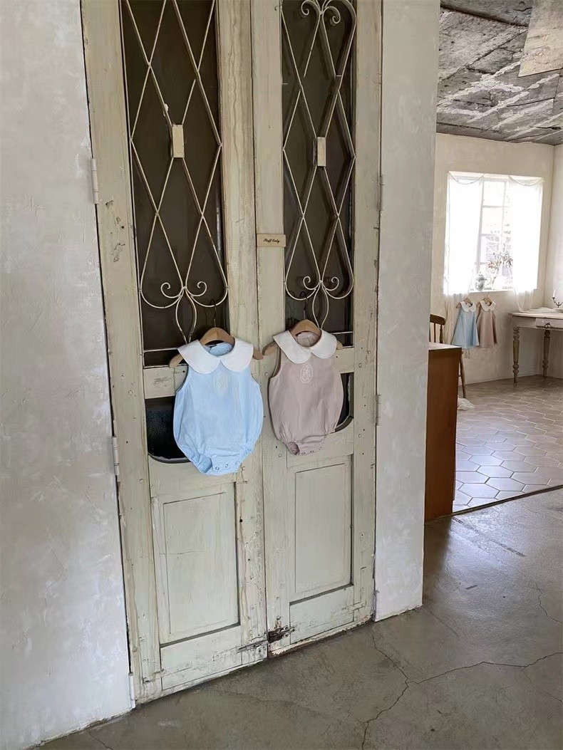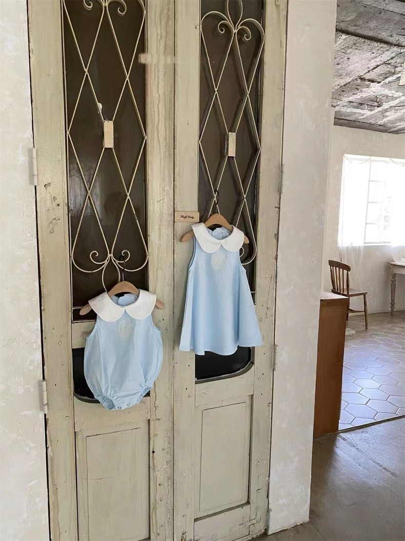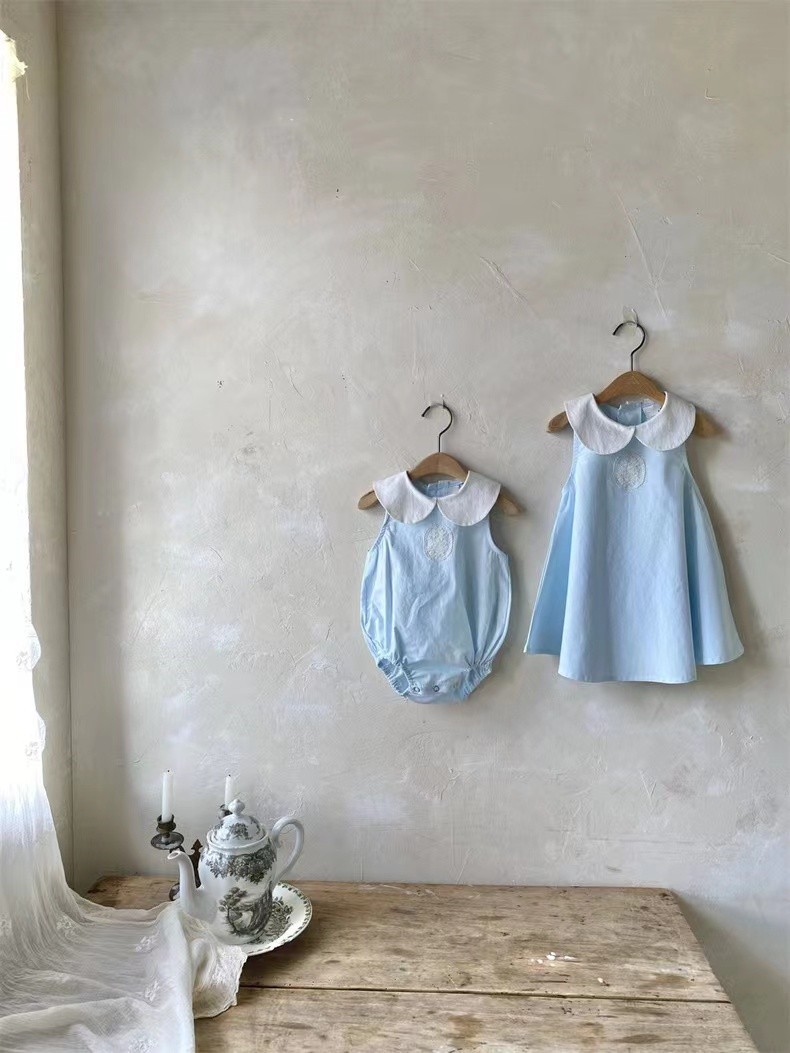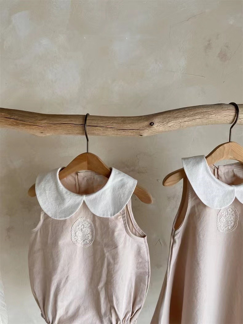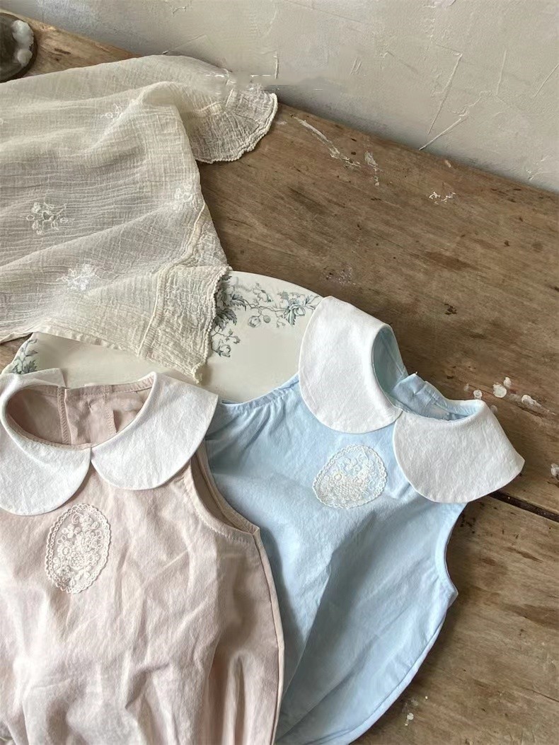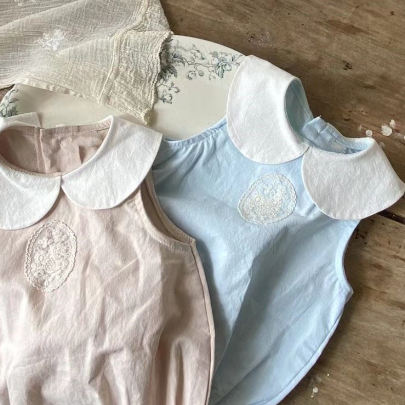 Color: light blue lace patch doll collar sleeveless jumpsuit, light pink lace patch doll collar sleeveless jumpsuit, light blue lace patch doll collar sleeveless dress, light pink lace patch doll collar sleeveless dress