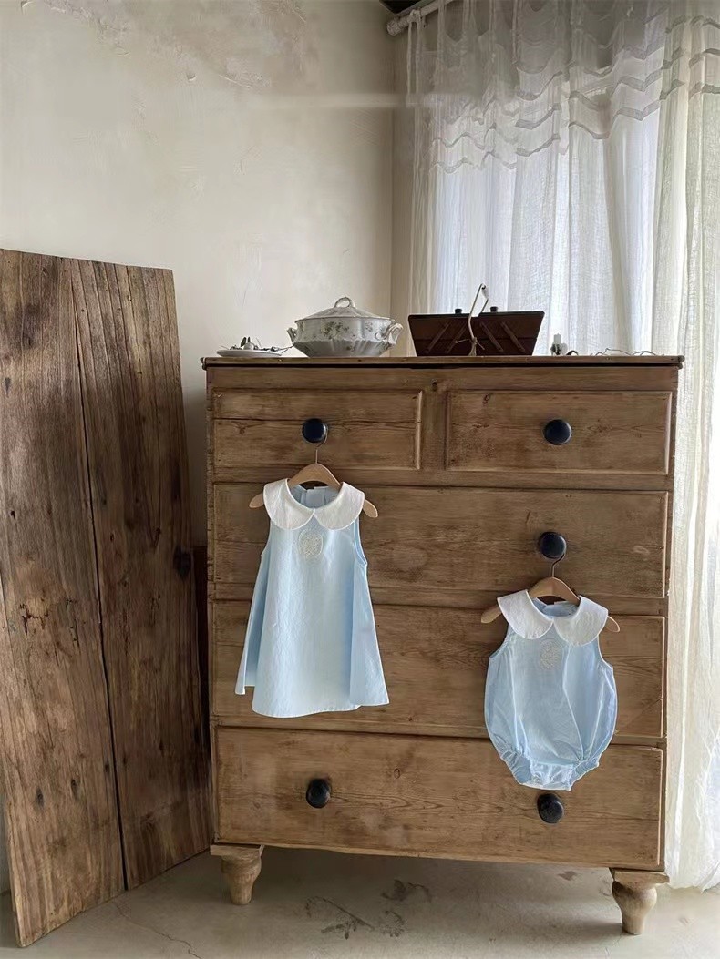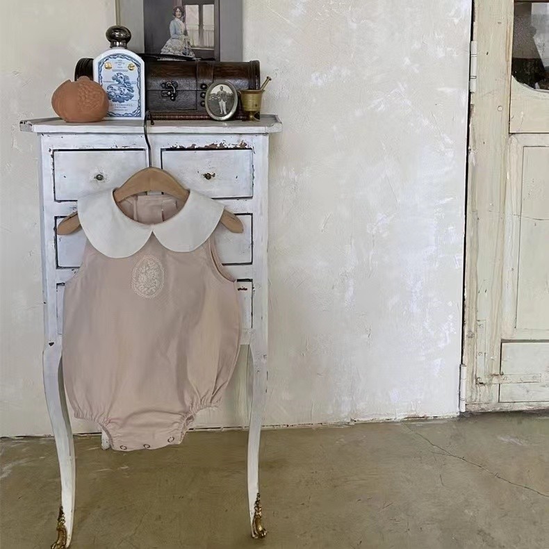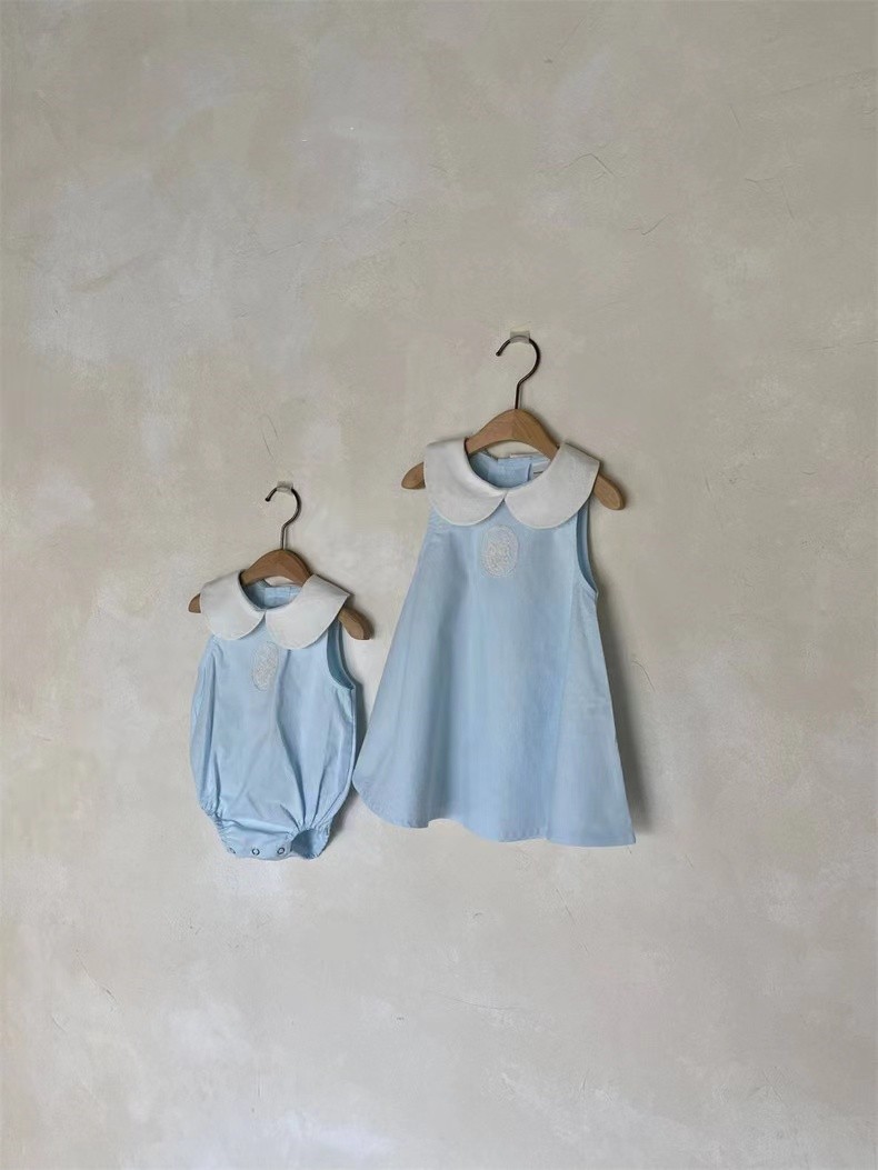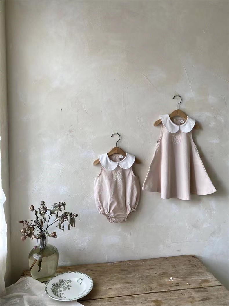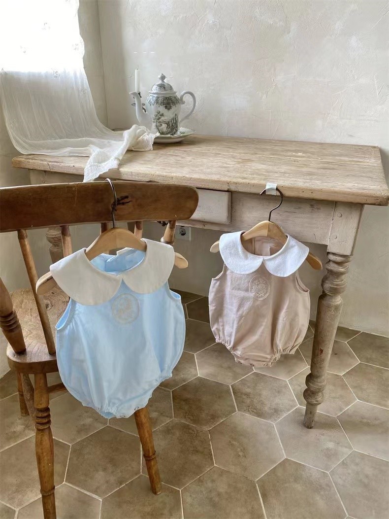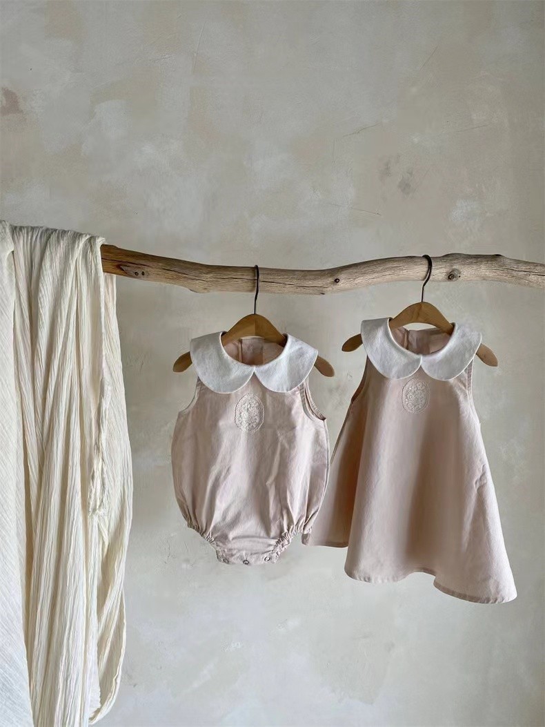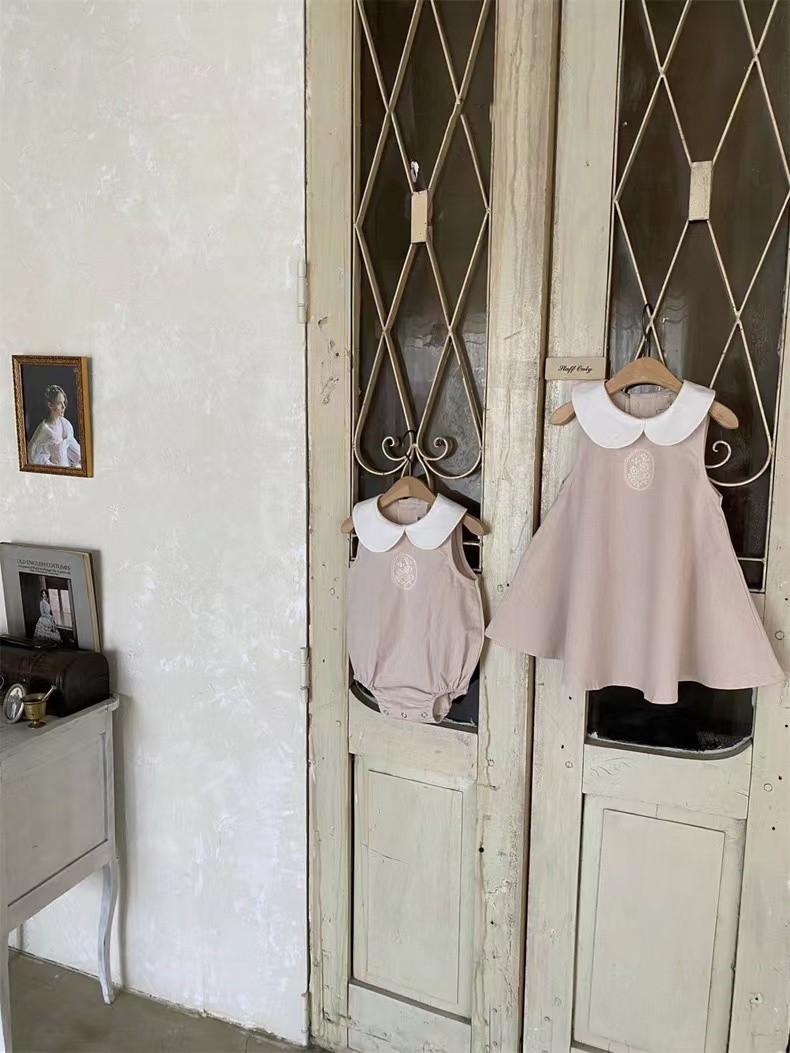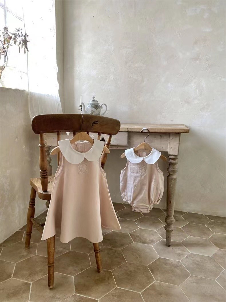 Color: light blue lace patch doll collar sleeveless jumpsuit, light pink lace patch doll collar sleeveless jumpsuit, light blue lace patch doll collar sleeveless dress, light pink lace patch doll collar sleeveless dress