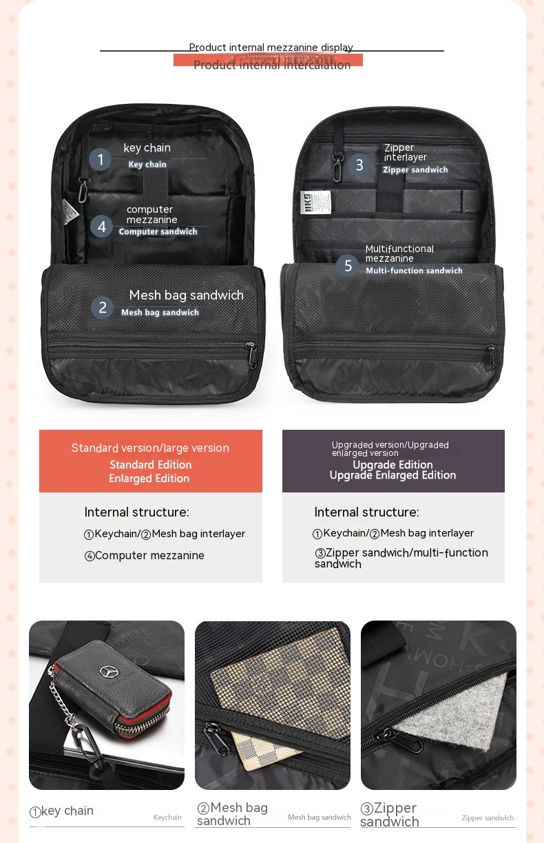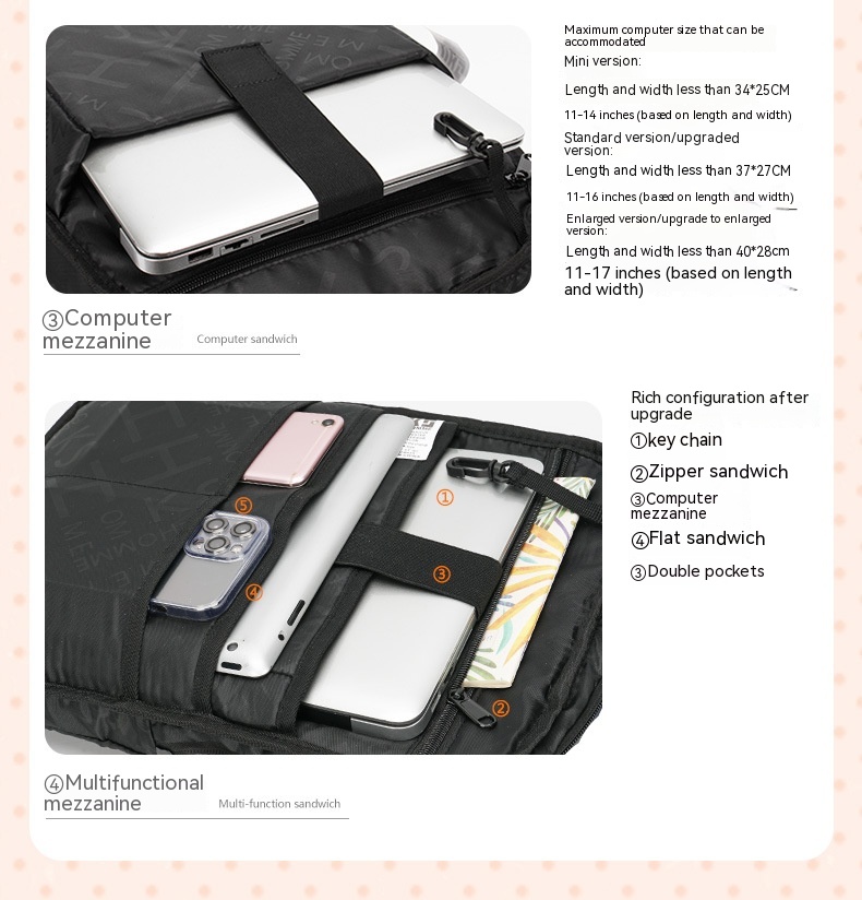 Bag internal structure: zipper changing bag, computer pocket