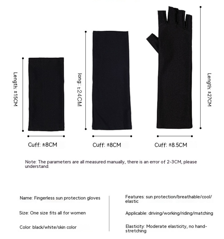 Color: Long (27cm) half finger black, long (27cm) half finger White, Long (27cm) half finger skin color, long (24cm) full finger black, long (24cm) full finger White, long (24cm) full finger skin color