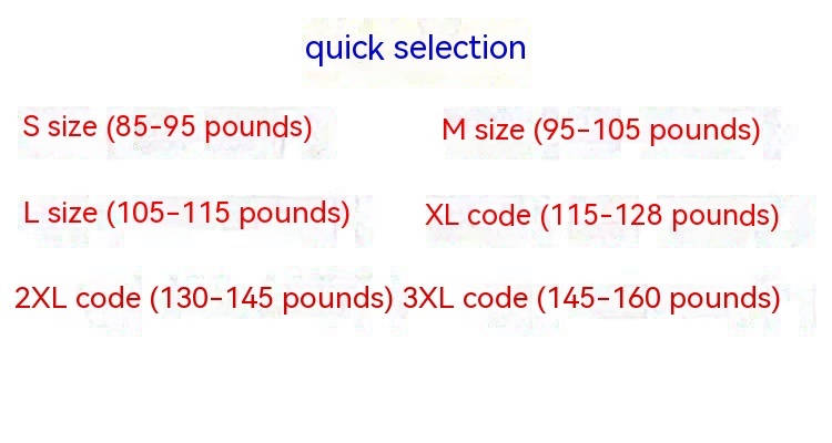 Size: S recommend 40.00kg-47.50kg,M recommend 47.50kg-52.50kg,L recommend 52.50kg-59.00kg,XL recommend 59.00kg-68.00kg,2XL recommend 67.50kg-72.50kg,3XL recommend 72.50kg-80.00kg,4XL recommend 80.00kg-90.00kg