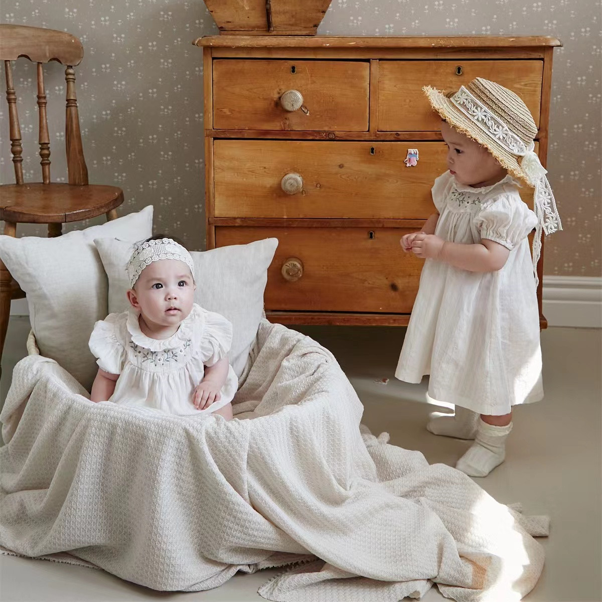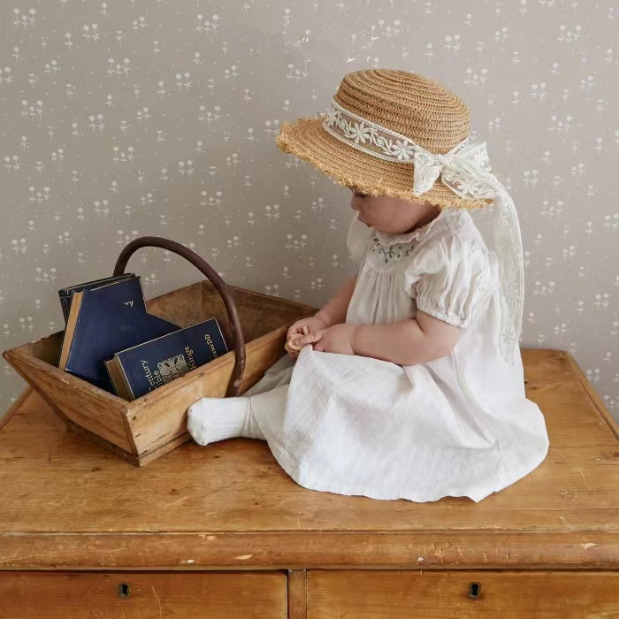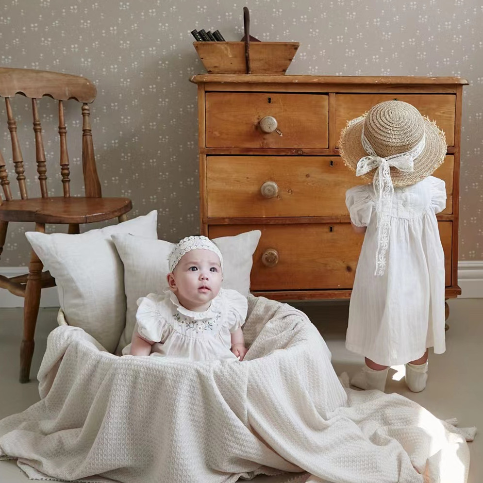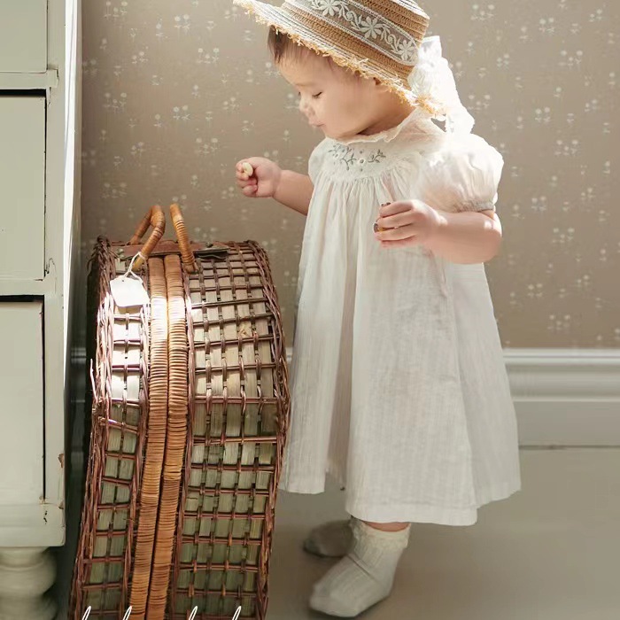 Color: white embroidered flower puff short sleeve romper, white embroidered flower puff short sleeve dress