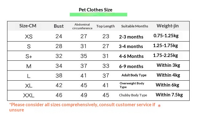 Sizes: XS fits 0.75–1.25 kg, S fits 1.25–1.75 kg, S+ fits 1.75–2.25 kg, M fits up to 3.25 kg, L fits up to 4 kg, XL fits up to 6 kg, XXL fits up to 7.5 kg