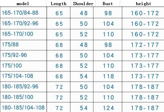 Size: 165-170/88, 165-170/92-96, 165-170/100, 175/88, 175/92-96, 175/100, 175/104-108, 180-185/92-96, 180-185/100, 180-185/104-108