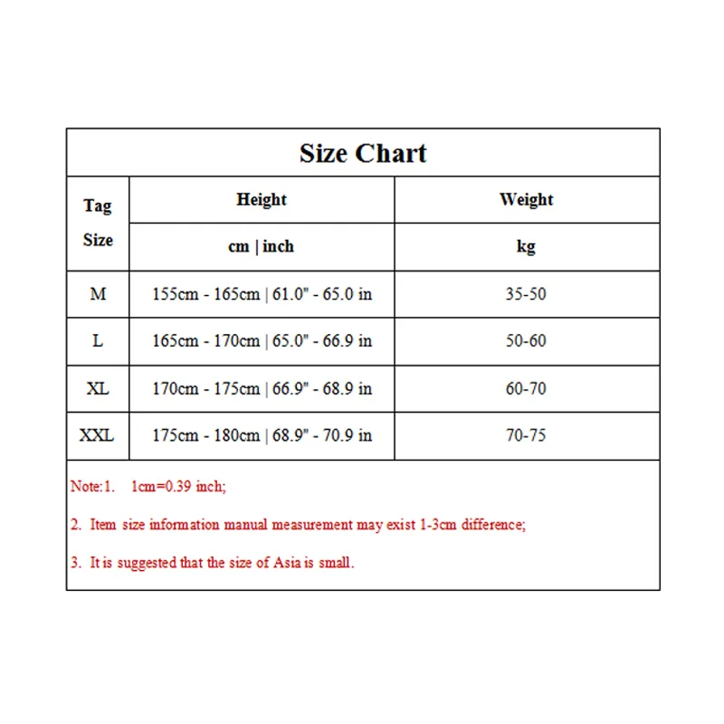 1. Asian sizes are 1 to 2 sizes smaller than European and American people. Choose the larger size if your size between two sizes. Please allow 2-3cm differences due to manual measurement.