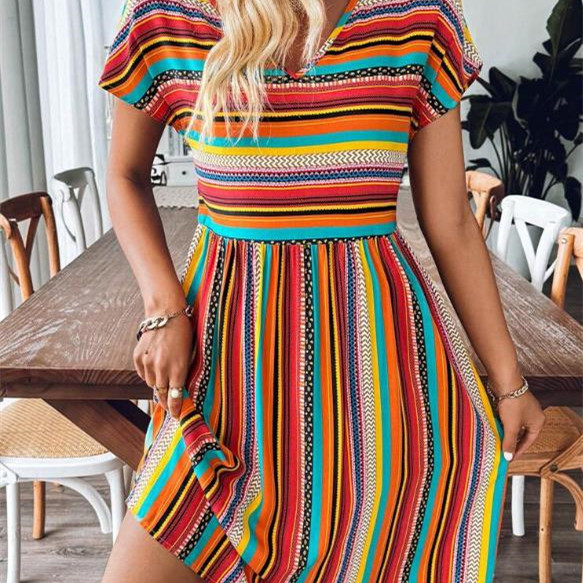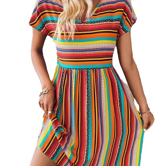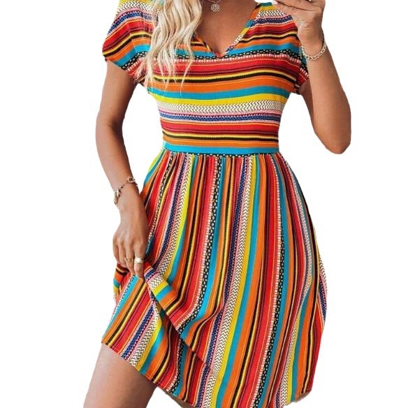 Summer New European And American Women's Clothing Color Striped Batwing Sleeve Dress