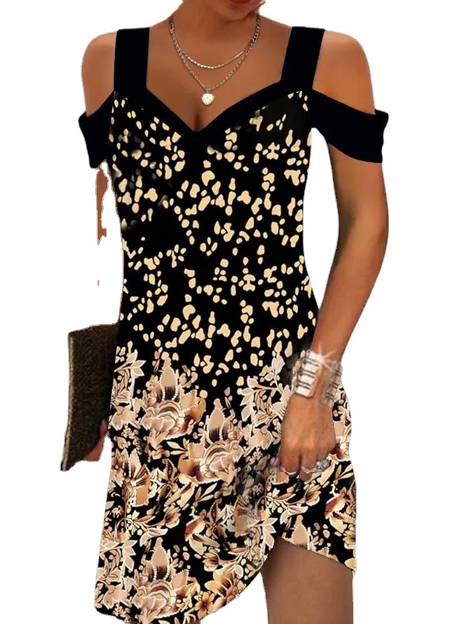 Summer New Fashion Colorblock Printed V-neck Off-the-shoulder Strap Dress