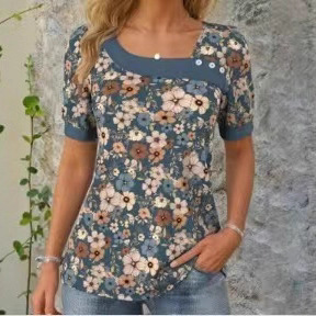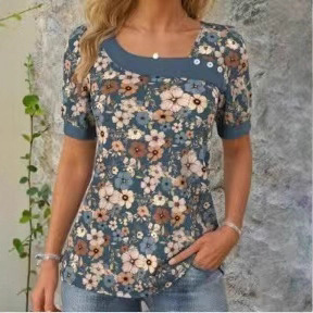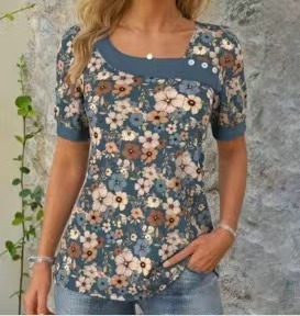 Summer New Floral Button T-shirt For Women Short Sleeve Round Neck Top