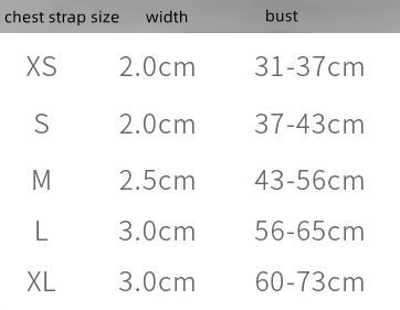 Specifications (L*W): chest strap-XS, chest strap-S, chest strap-M, chest strap-L, chest strap-XL, suit XS+150cm*2.0cm, suit S+150cm*2.0cm, suit M +150cm*2.0cm, Suit L+150cm*2.5cm, Suit XL+150cm*2.5cm