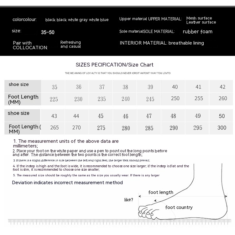Size: 35, 36, 37, 38, 39, 40, 41, 42, 43, 44, 45, 46, 47, 48, 49, 50