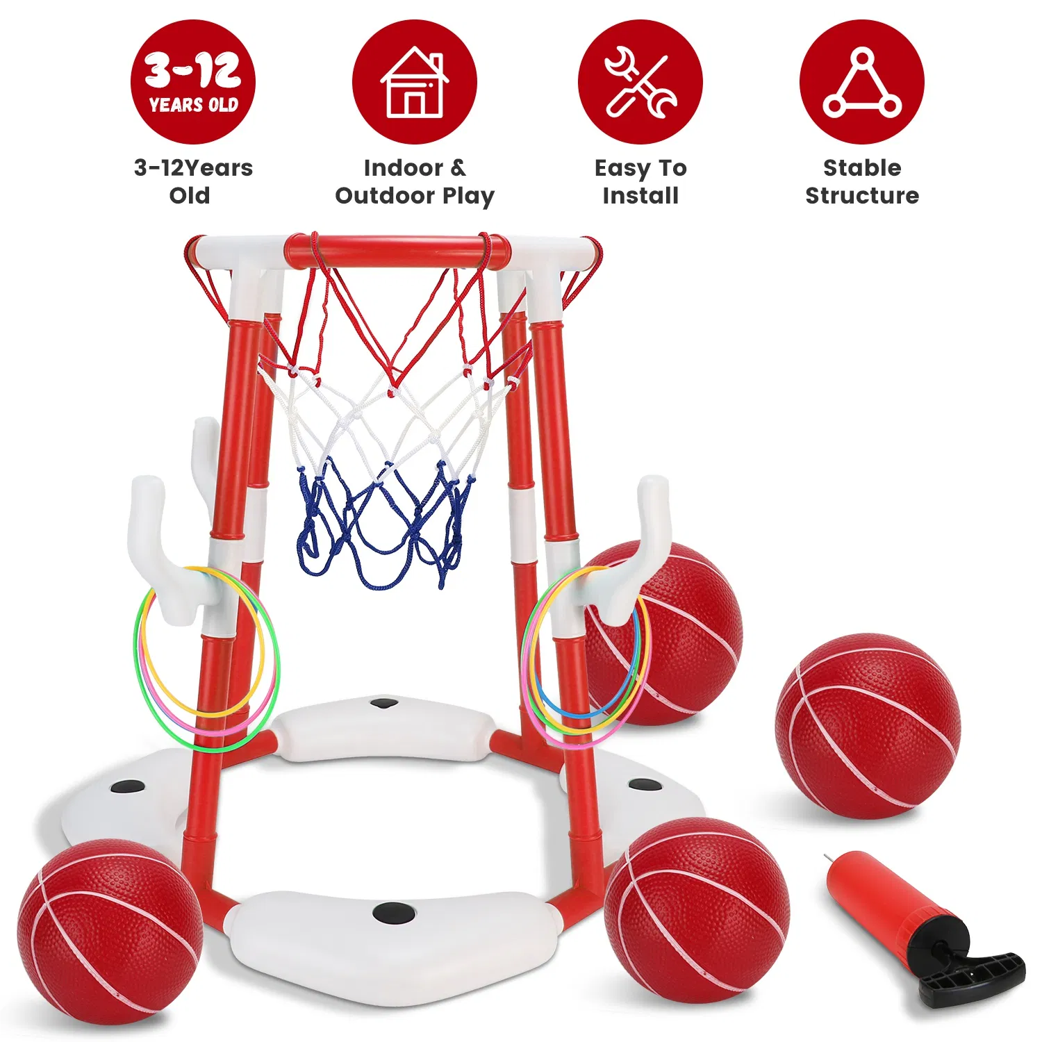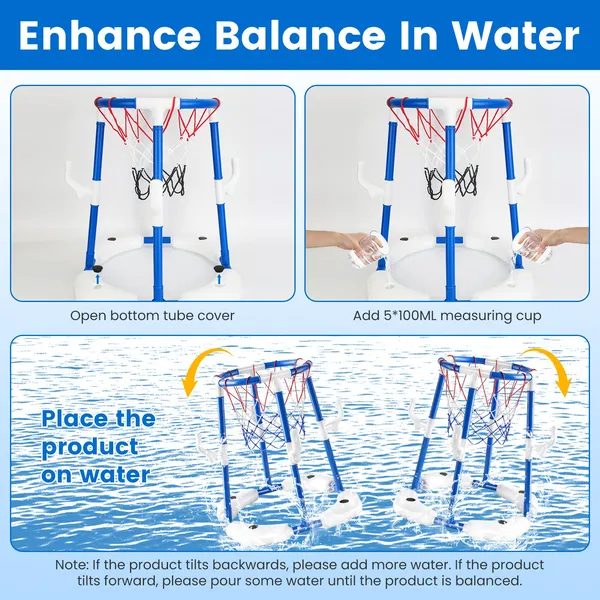 *Pool Basketball Toy Set*:Our summer pool basketball hoop toy set includes a blue/red basketball hoop,4 balls,4 circles and a convenient pump,designed to bring endless excitement and enjoyment to you and your family. Whether you're organizing a themed pool party or just looking for ways to enjoy a sunny day,this set is an excellent addition to your summer activities.