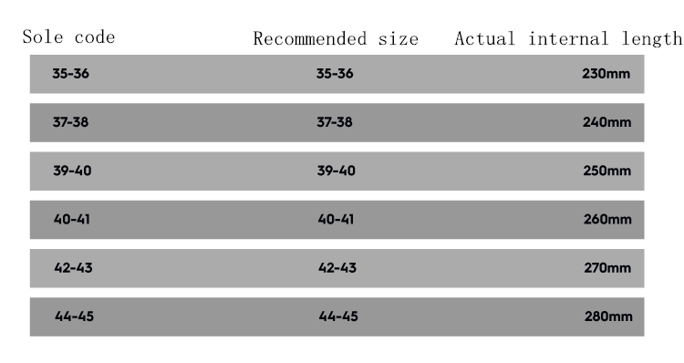 Size: 35-36 (recommended 35-36), 37-38 (recommended 37-38), 39-40 (recommended 39-40), 40-41 (recommended 40-41), 42-43 (recommended 42-43 ), 44-45 (recommendation 44-45)