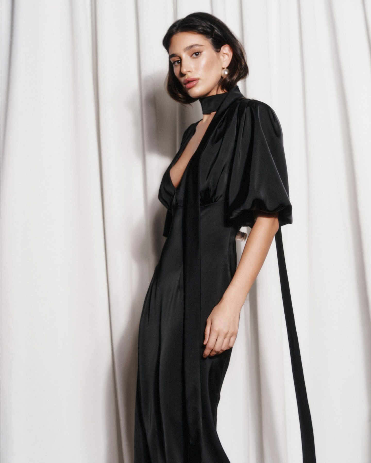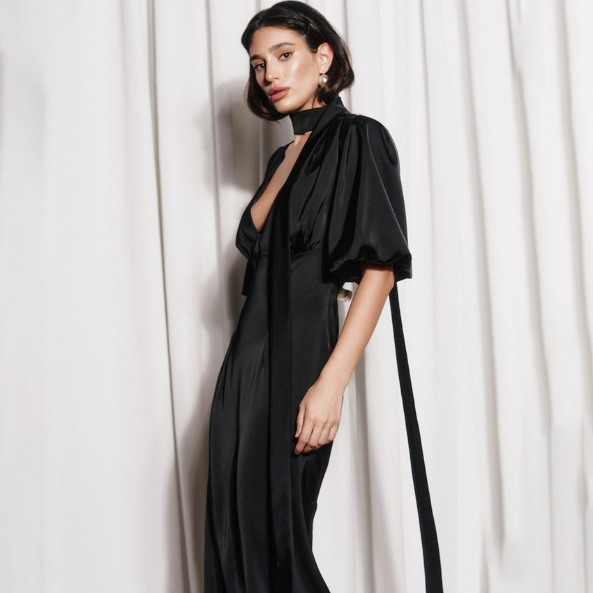 Popular elements: V-neck, cinched waist, bow tie