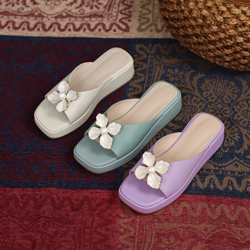 Summer Square Toe Mid-heel Sandals Thick-soled Three-dimensional Flower Women's Shoes
