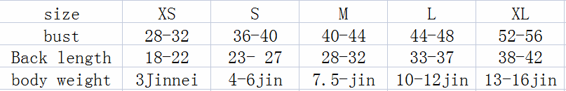 Size: XS- about 2-3 kg, S- about 4-6 kg, M- about 7-8 kg, L- about 10-12 kg, XL- about 14-18 kg