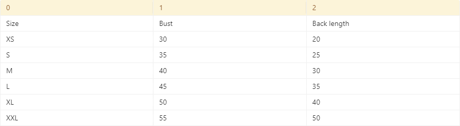 Size: XS back length 19 bust 29,S back length 24 bust 34,M back length 29 bust 39,L back length 34 bust 44,XL back length 39 bust 49,XXL back length 44 bust 54