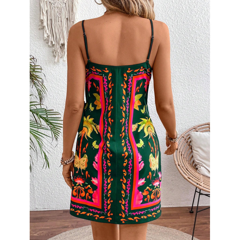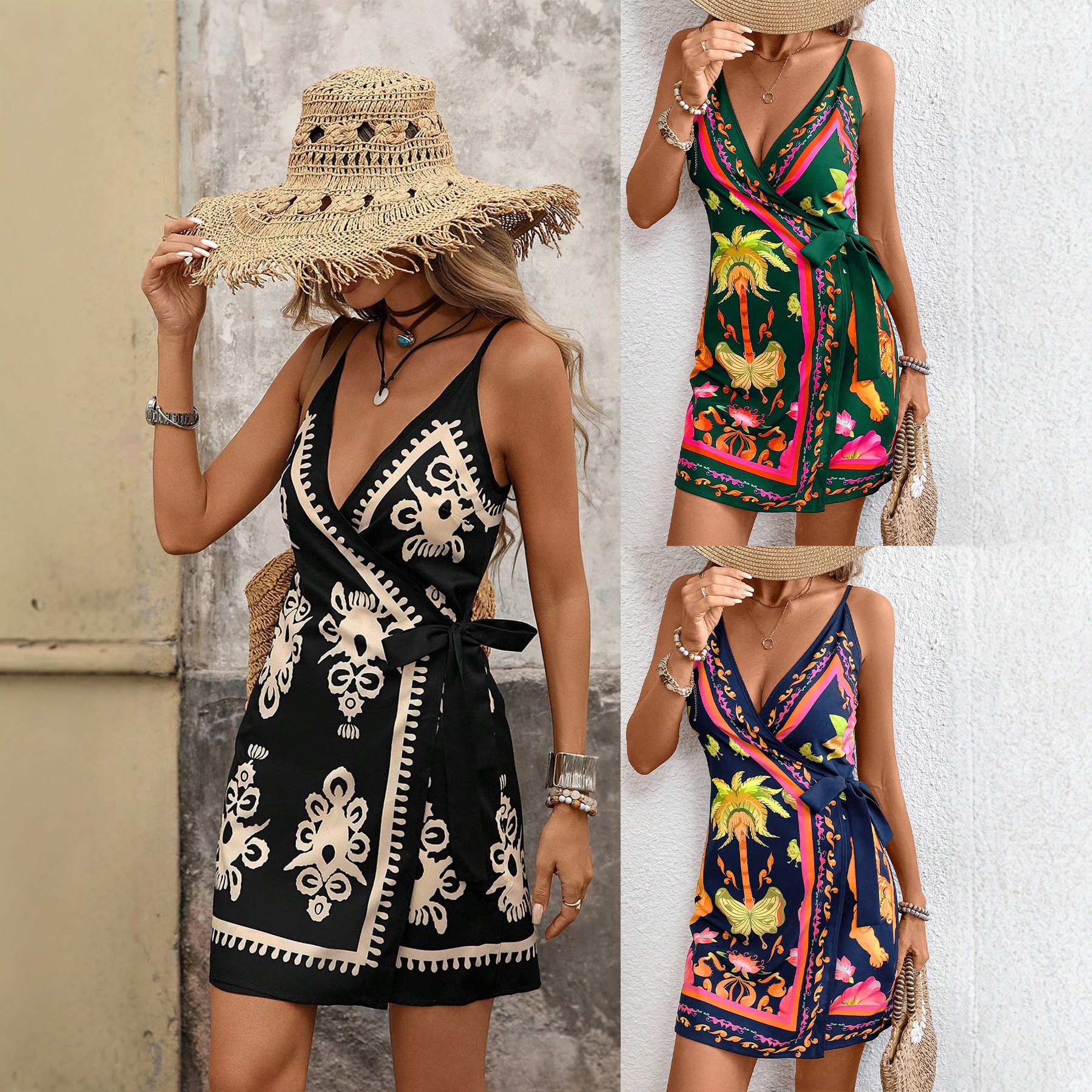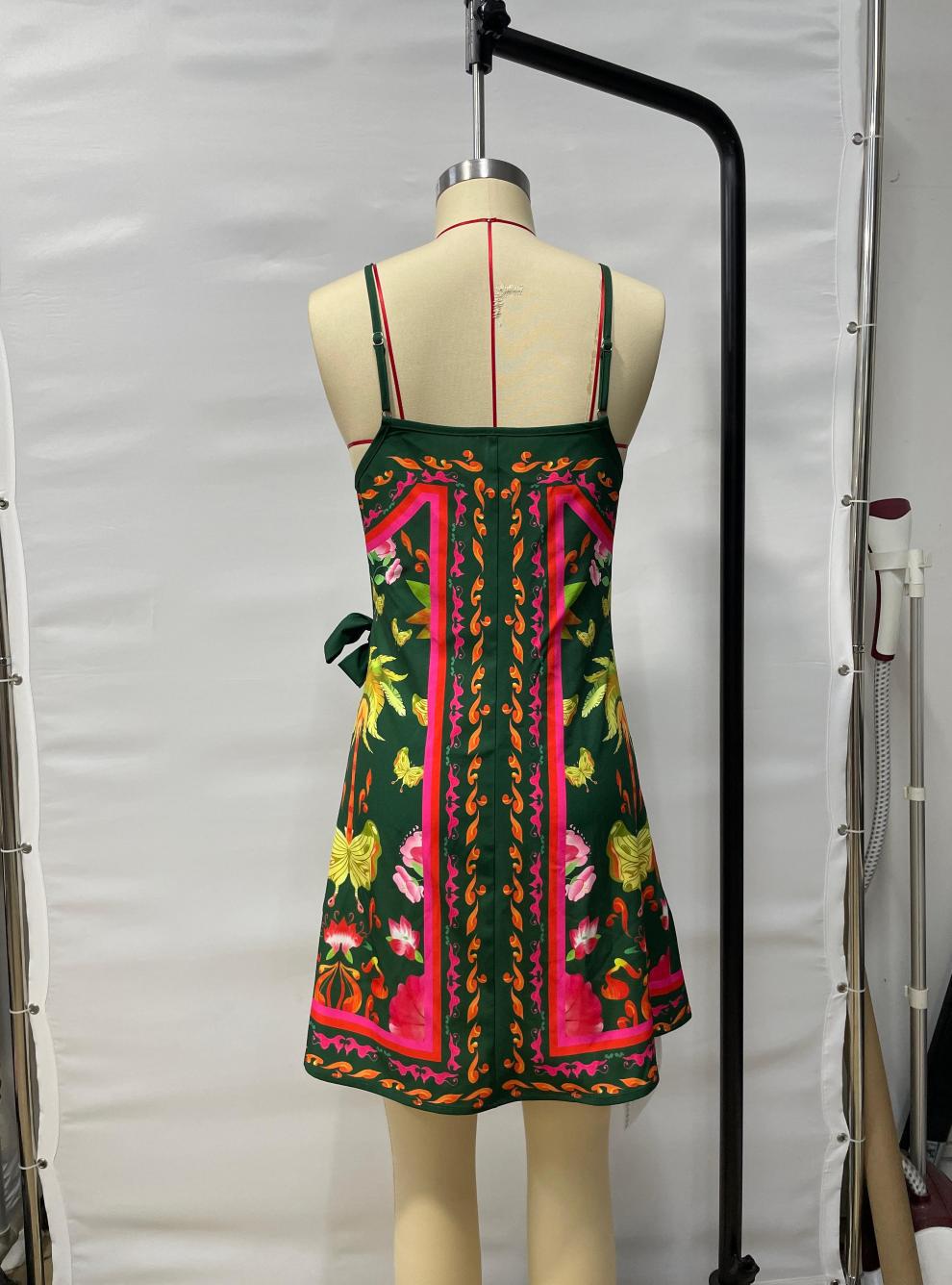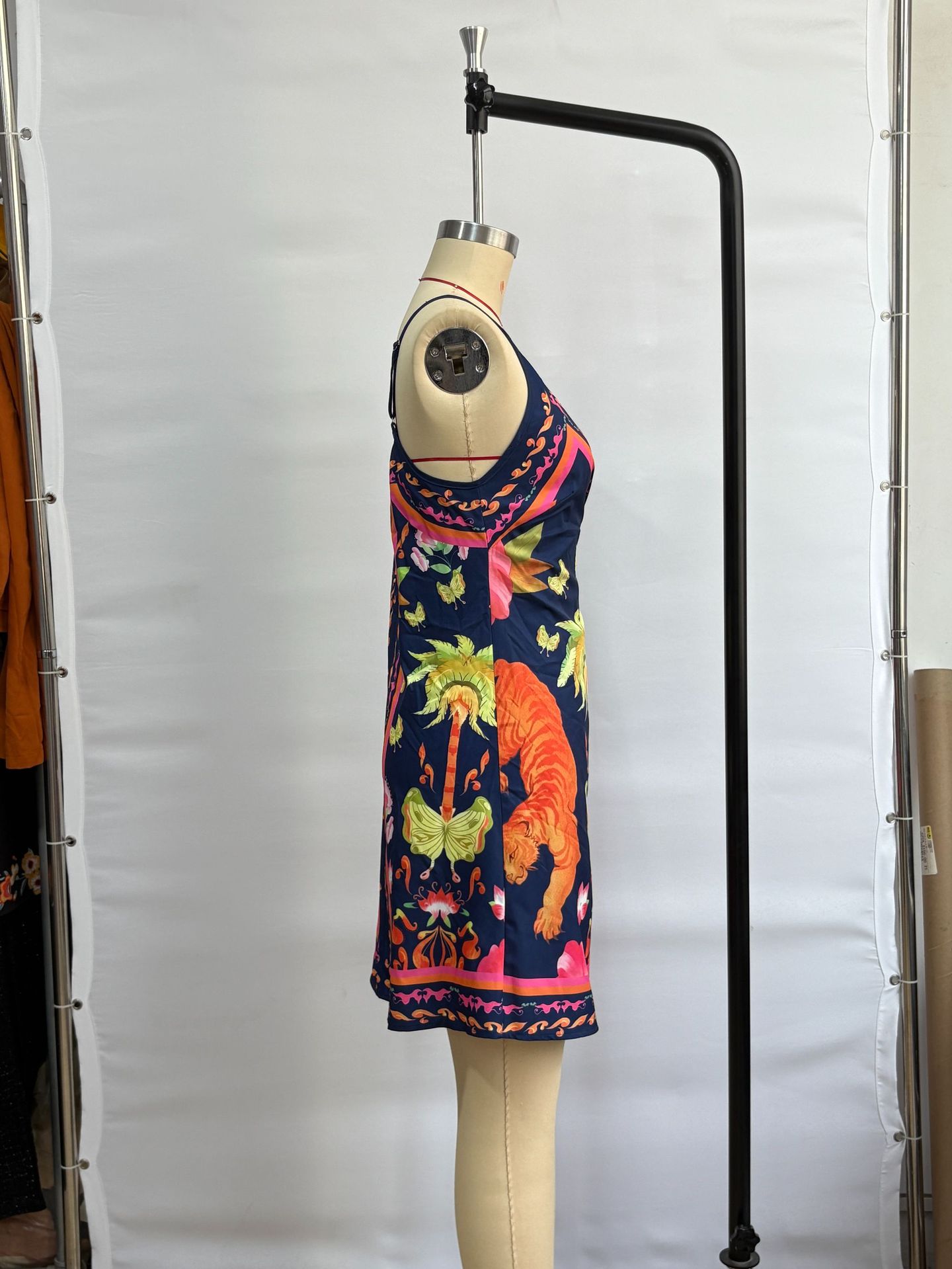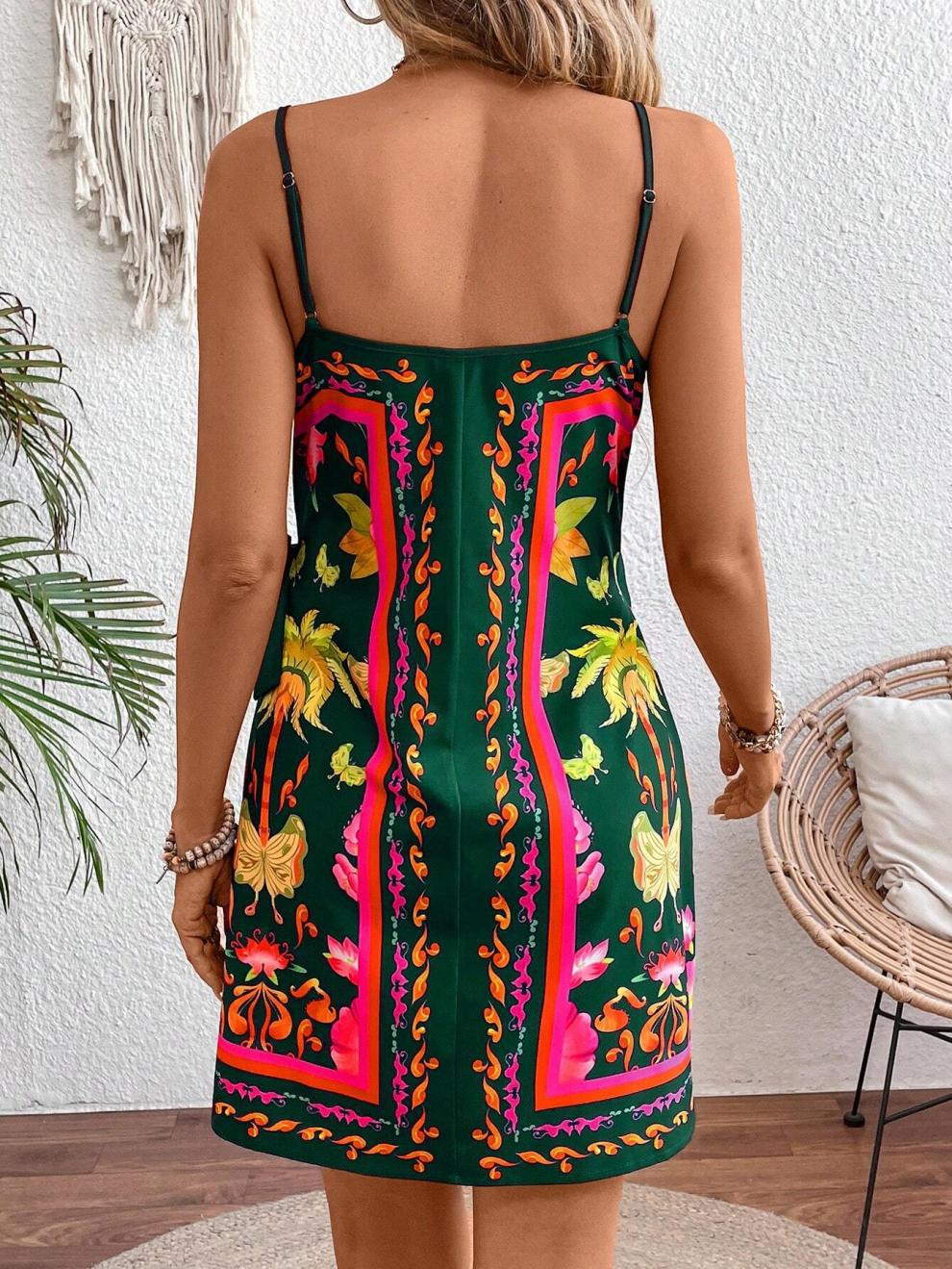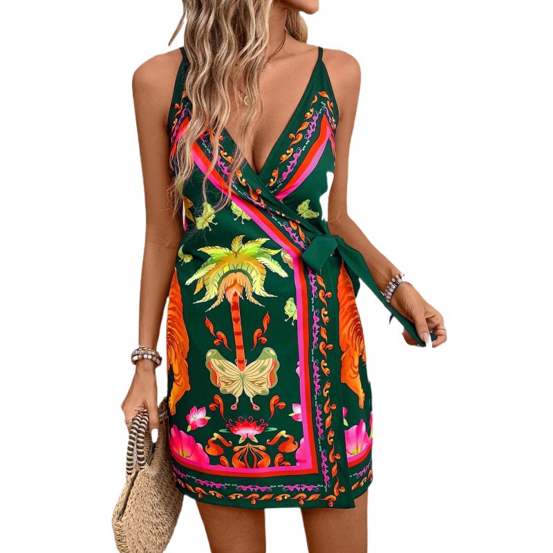 Summer Tropical Print Sleeveless Spaghetti-Strap Lace-Up Dress