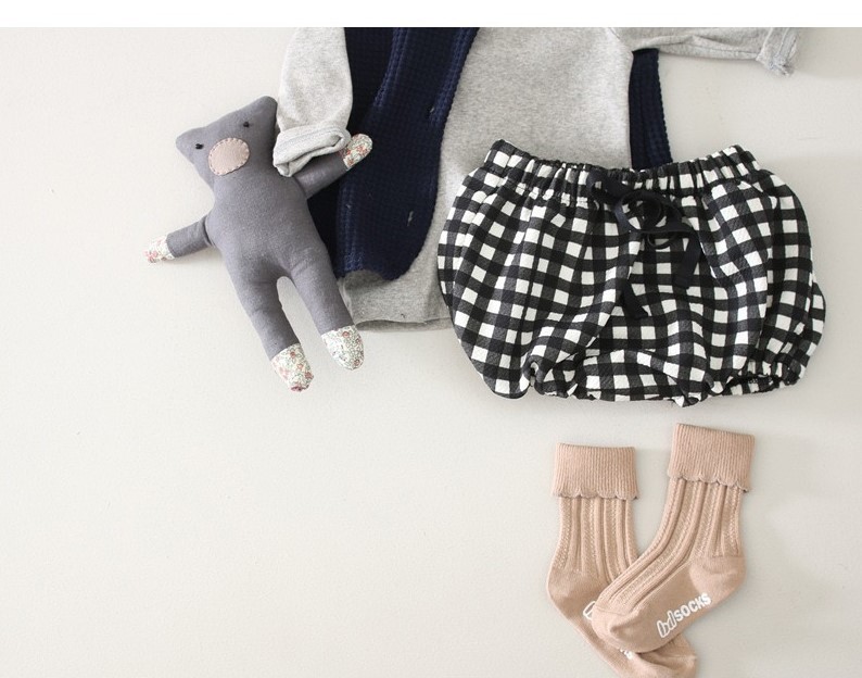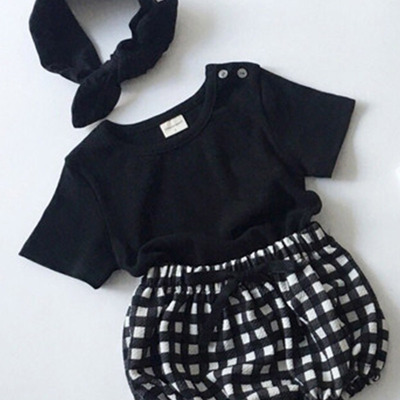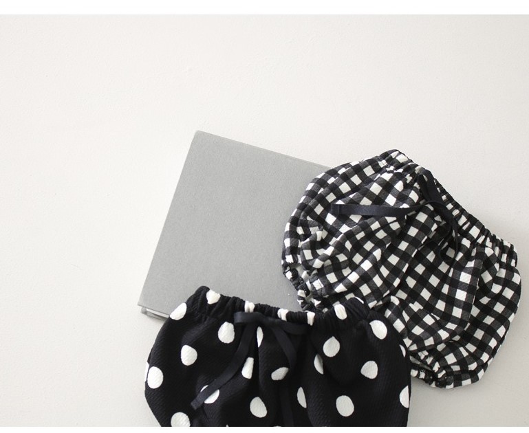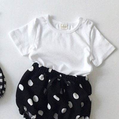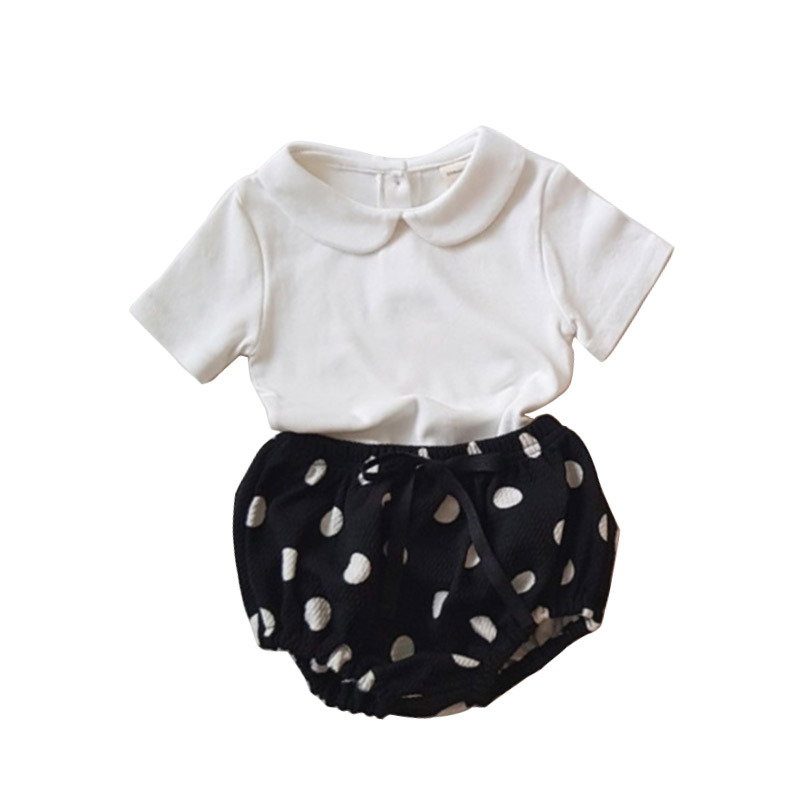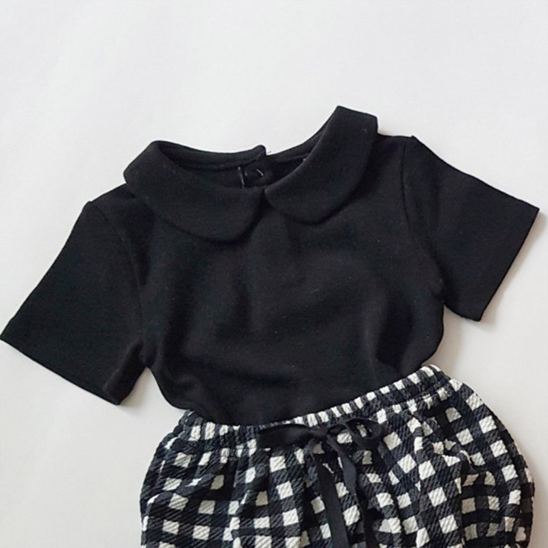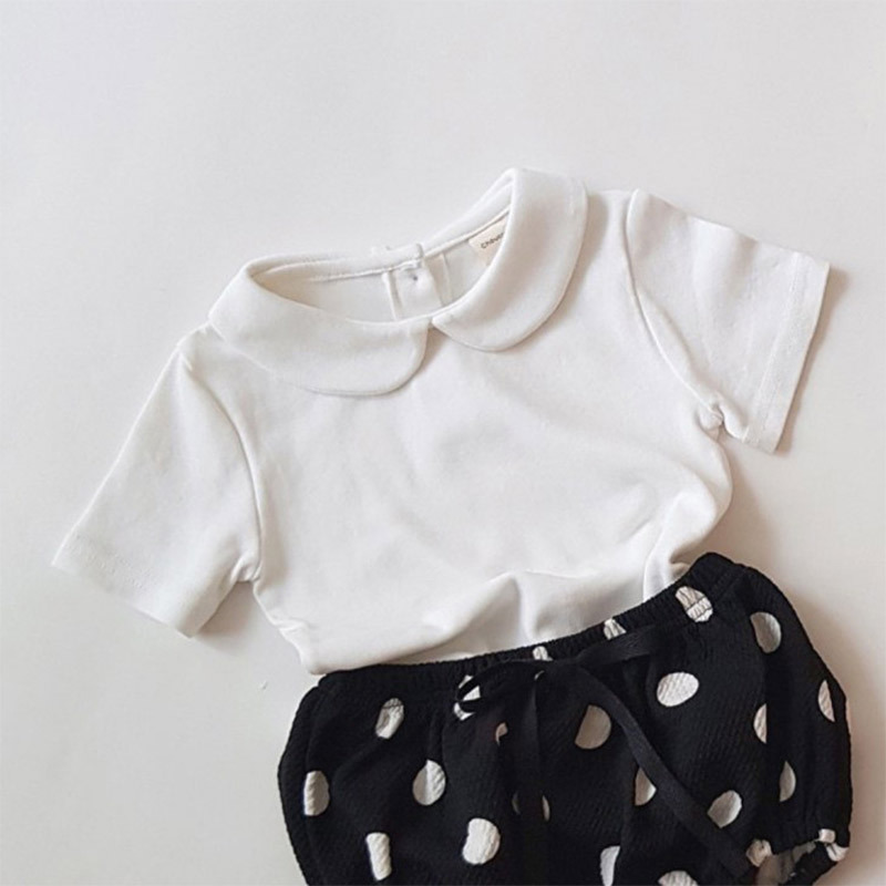 Color: white round neck T, black round neck T, White doll collar T, black doll collar T, polka dot shorts, plaid shorts