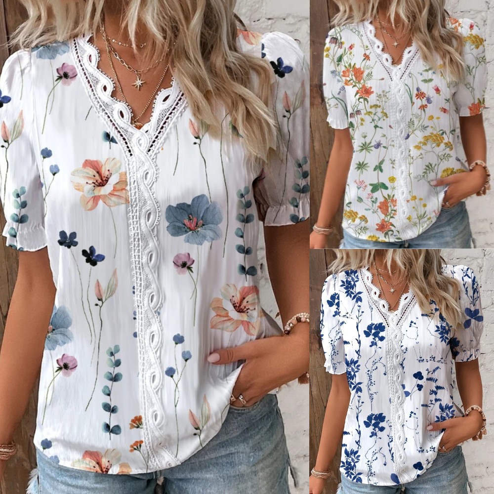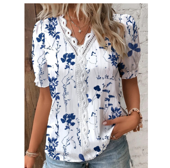 Summer V-neck Lace Stitching Printing Shirt For Women