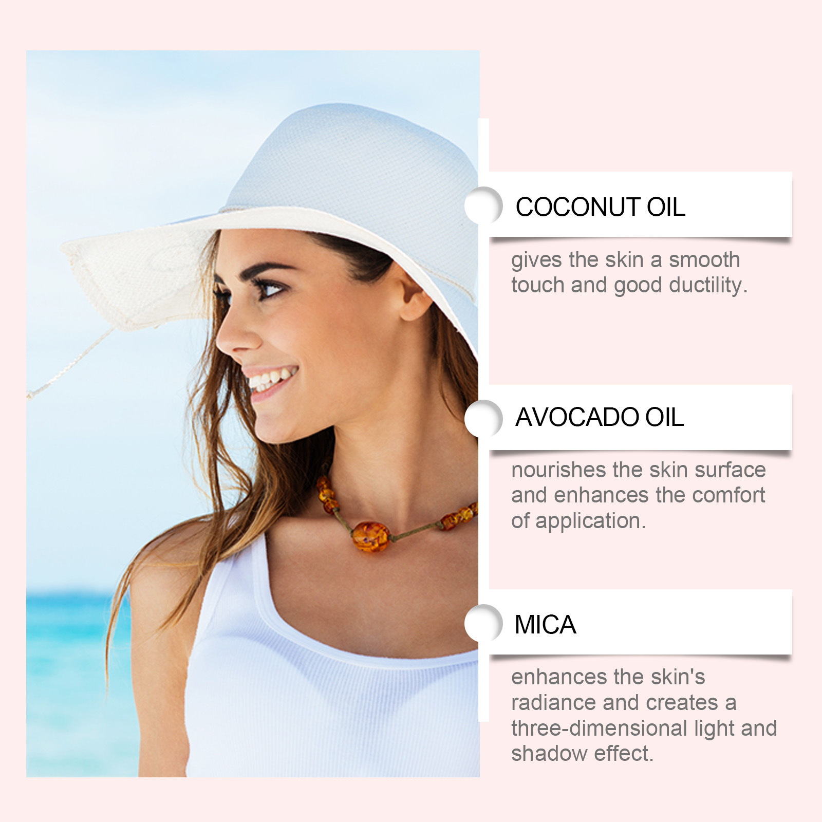 Ingredients: liquid paraffin, ethyl hexyl methoxycinnamate, orelin, ethyl hexyl salicylate, BIS-ethyl hexyloxyphenol methoxyphenyl triazine, vitamin E, ethyl hexyl glycerol, coconut oil, avocado oil, Mica