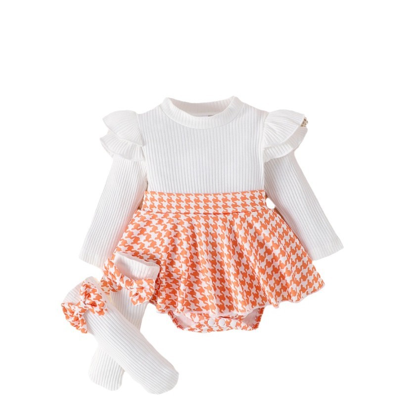 Sunken Stripe Long Sleeve Stitching Houndstooth Skirt One-piece Romper