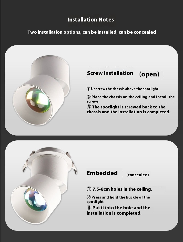 Power: Open-mounted 7W White, open-mounted 12W White, embedded 7W white hole 65-80mm, open-mounted 7W Black, open-mounted 12W Black, embedded 7W Black hole 65-80mm