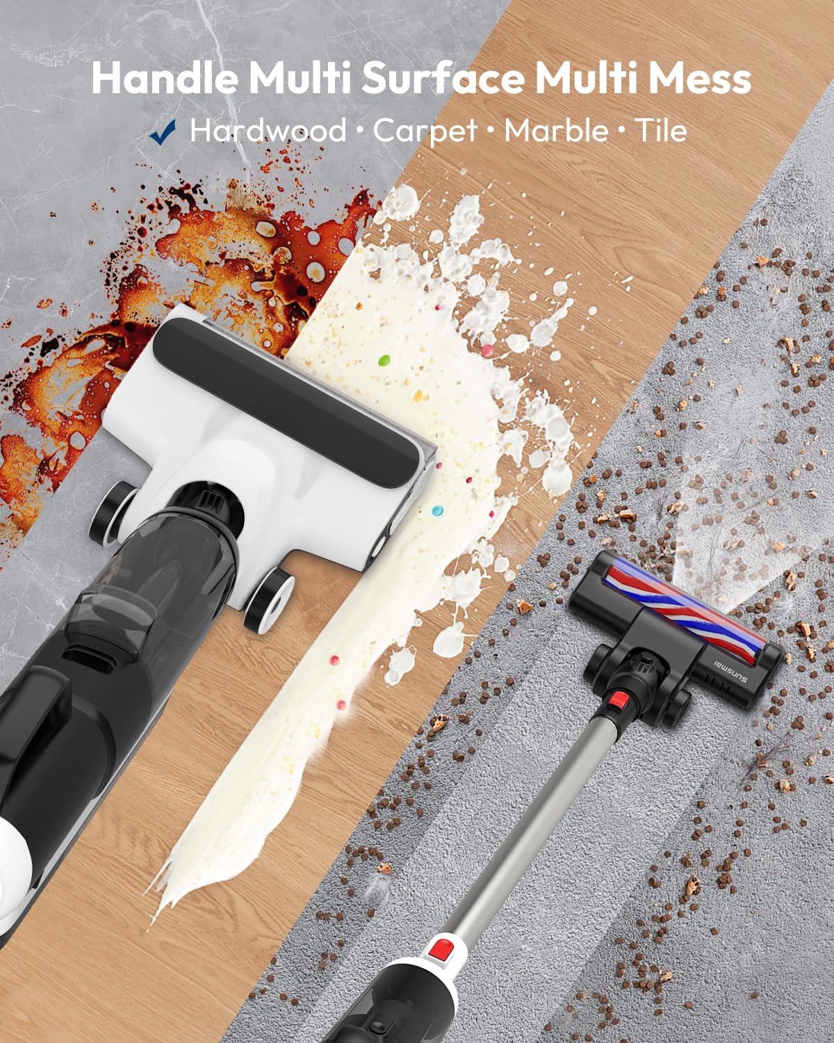 This 5-in-1 cordless wet and dry vacuum cleaner offers up to 55 minutes of powerful cleaning on a single charge. Lightweight at 8.2 pounds, it easily cleans multiple rooms without cords. The detachable motor unit converts to a handheld vacuum with multiple attachments, perfect for corners, stairs, and upholstery. Self-propelled wheels and a roller brush clean as close as 0.2 inches from walls and baseboards for precise edge cleaning. After use, place it on the compact storage base and activate the self-cleaning function with a long press, making maintenance simple. The base also stores all accessories neatly. Safe for hardwood, tile, marble, laminate, and vinyl floors, it removes dirt and spills without scratching or streaking. Specifications: Runtime: up to 55 minutes Weight: 8.2 lbs Noise: 75 dB Edge cleaning distance: 0.2 inches Suitable floors: hardwood, tile, marble, laminate, vinyl Includes: detachable motor, vacuum attachments, storage base with self-cleaning