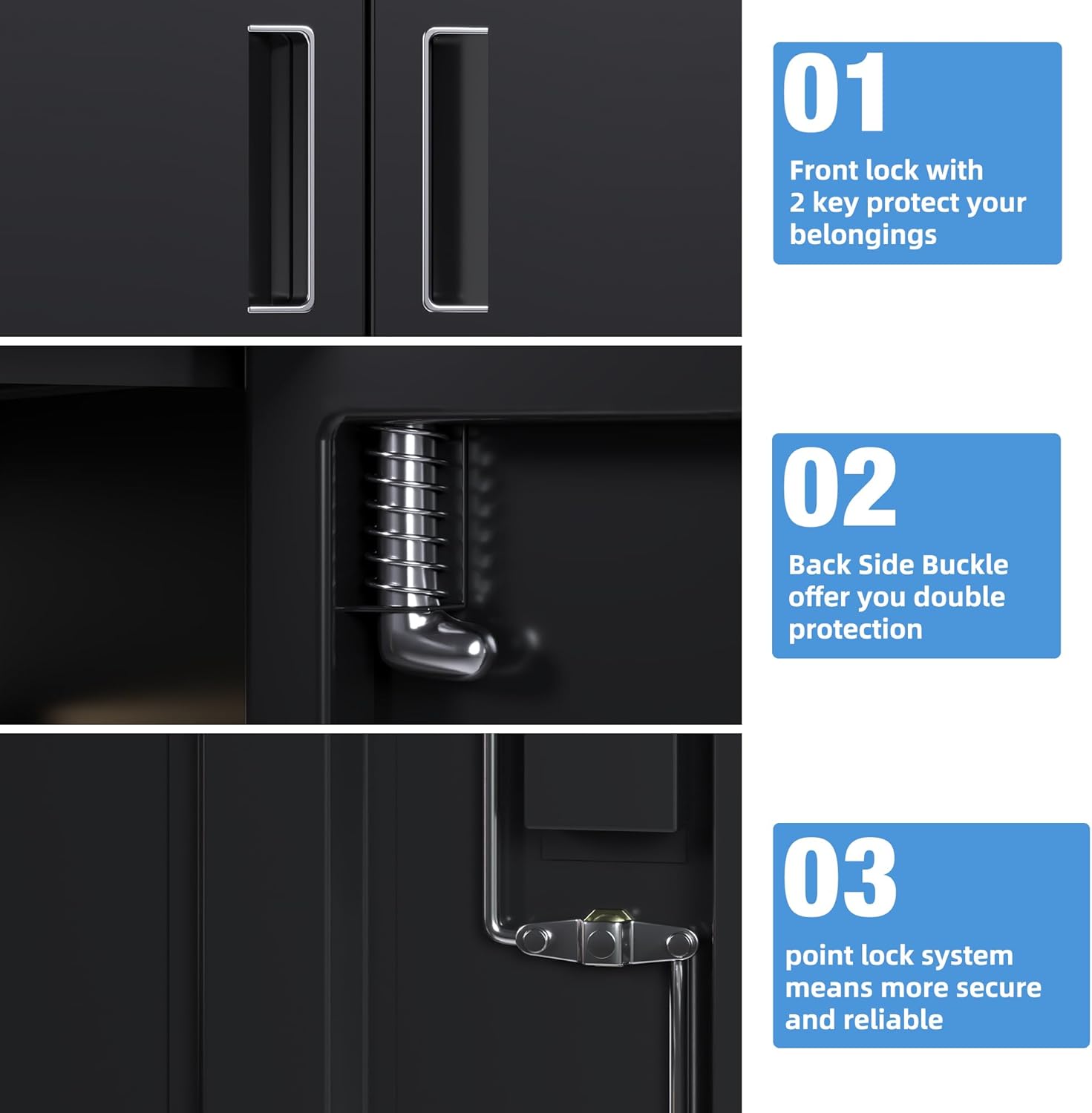 Safety lock: The right side of the metal storage cabinet is made of durable steel and security locks, which effectively protect the items stored in it from theft and loss.