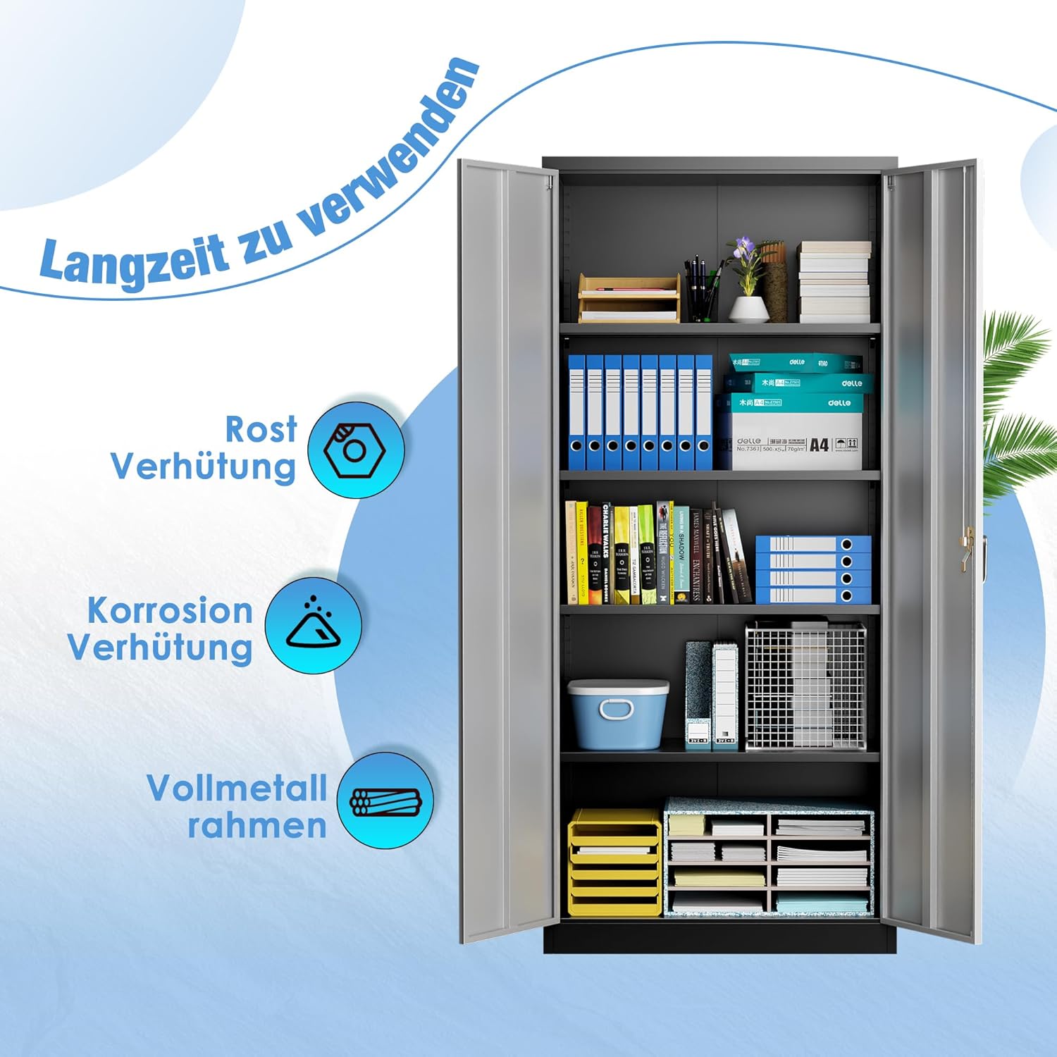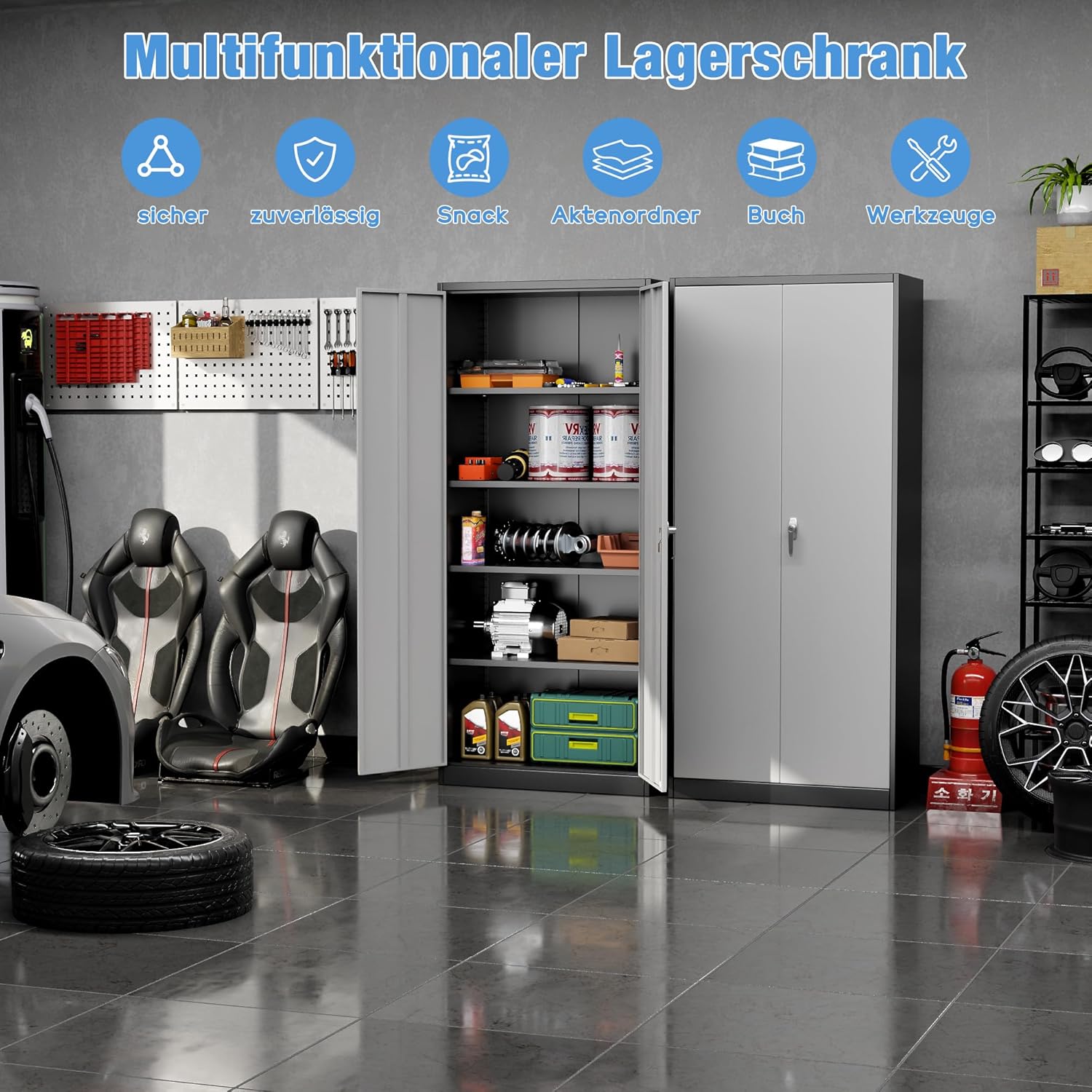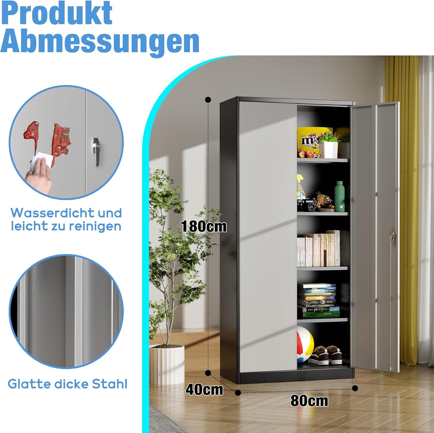 SUPEER Filing Cabinet, Metal Cabinet With 4 Height-Adjustable Shelves, Sheet Steel Powder Coating, Steel Cabinet For Tools, Garage H 180 Cm X W 80 Cm X D 40 Cm Black Grey