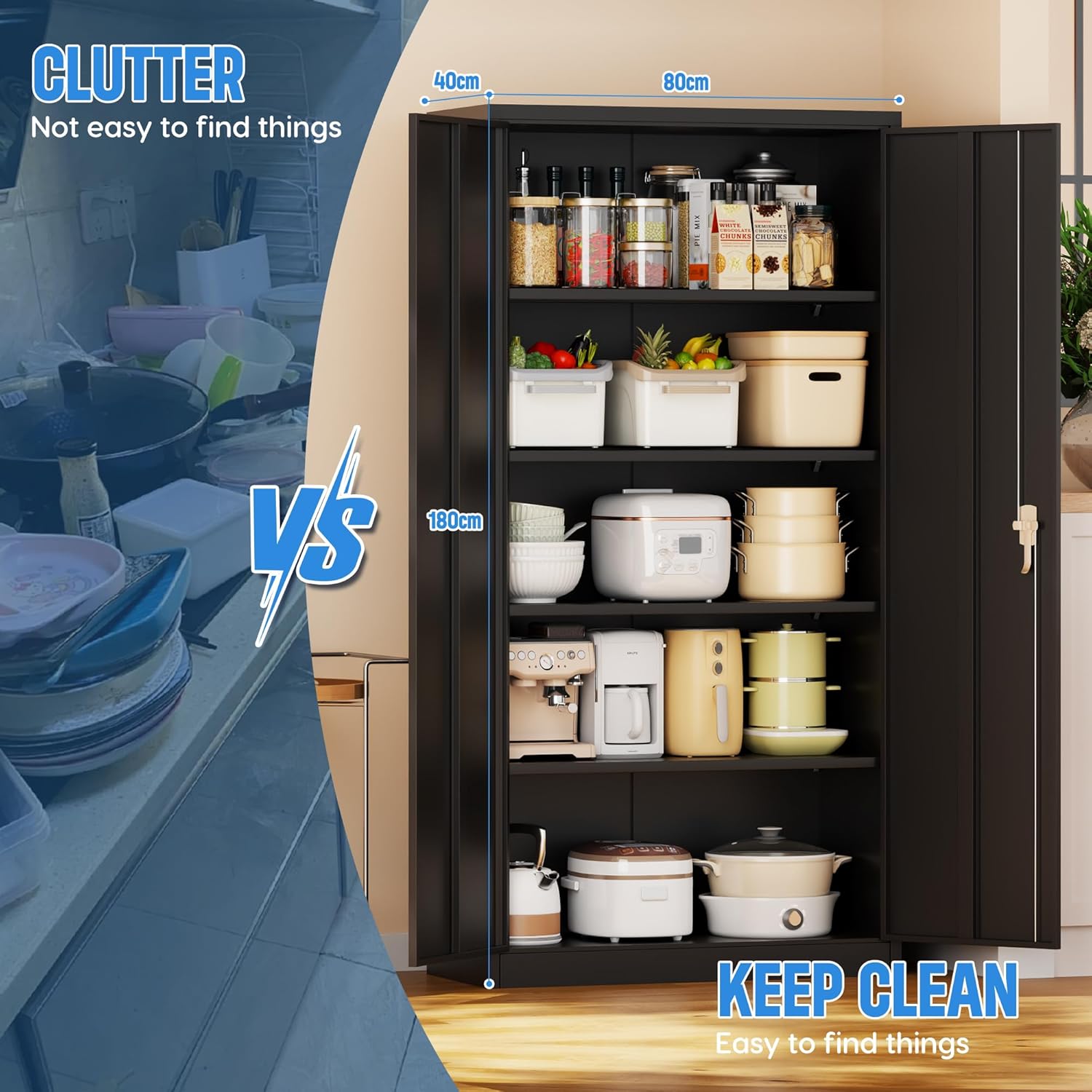 【Larger Storage Space】Storage Cabinet Size: H180cm×W80cm×D40.7cm.The metal cabinet with 2 adjustable shelves,you can move the shelves up or down according to your need.And each shelf can hold up to 68 pounds.