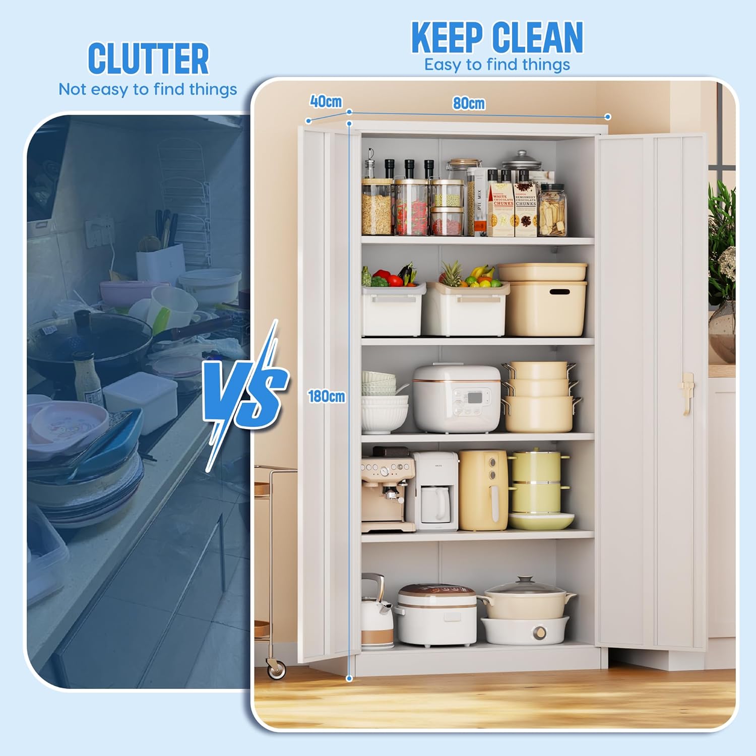 【Larger Storage Space】Storage Cabinet Size: H180cm×W80cm×D40cm.The metal cabinet with 4 adjustable shelves,you can move the shelves up or down according to your need.And each shelf can hold up to 68KG.
