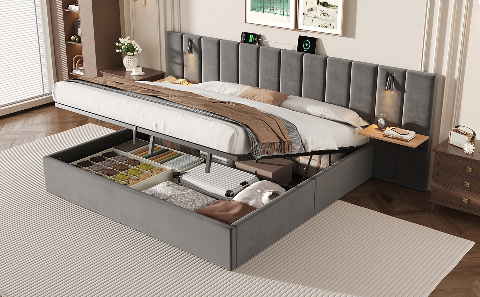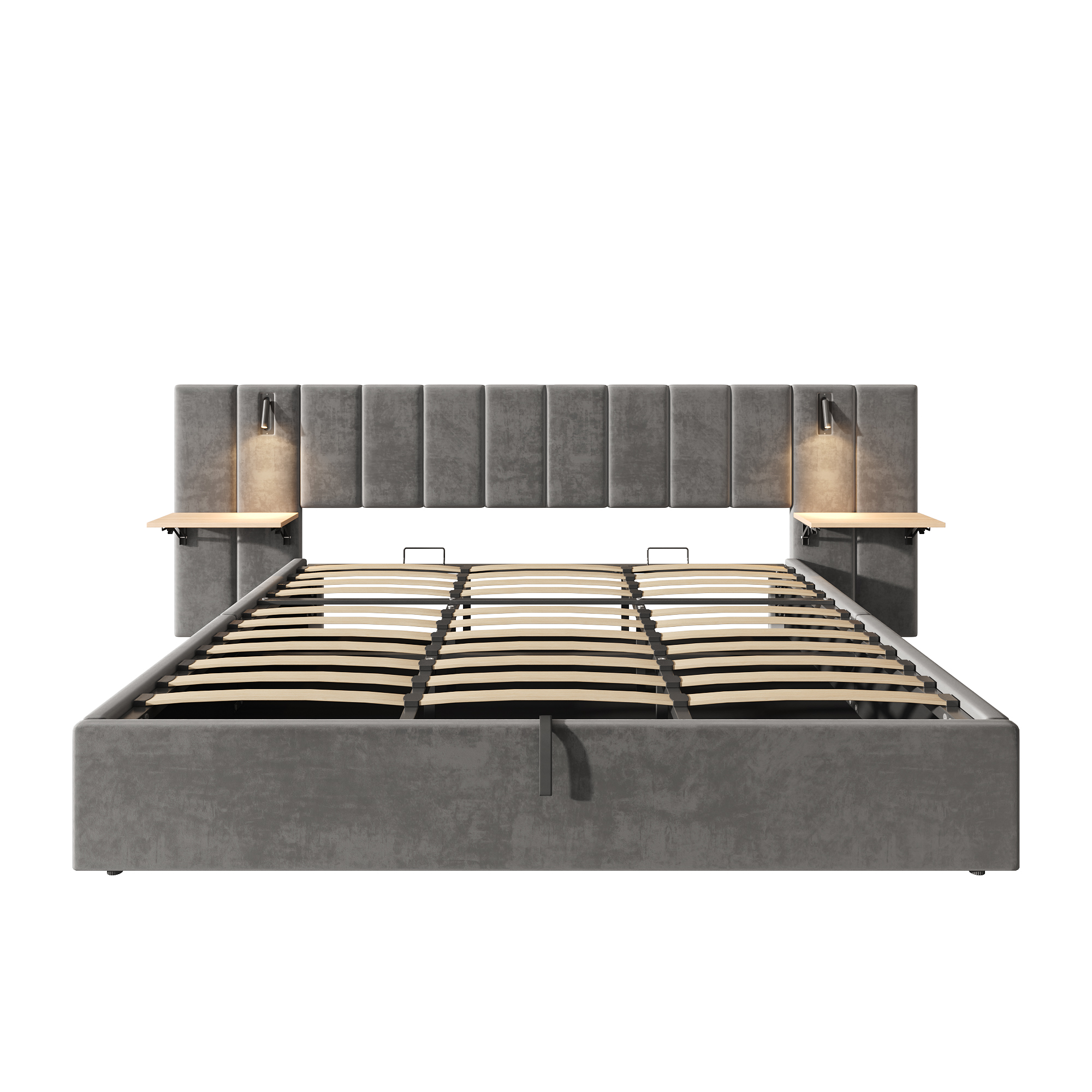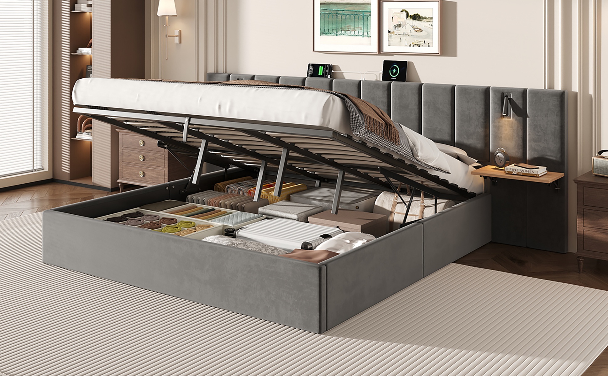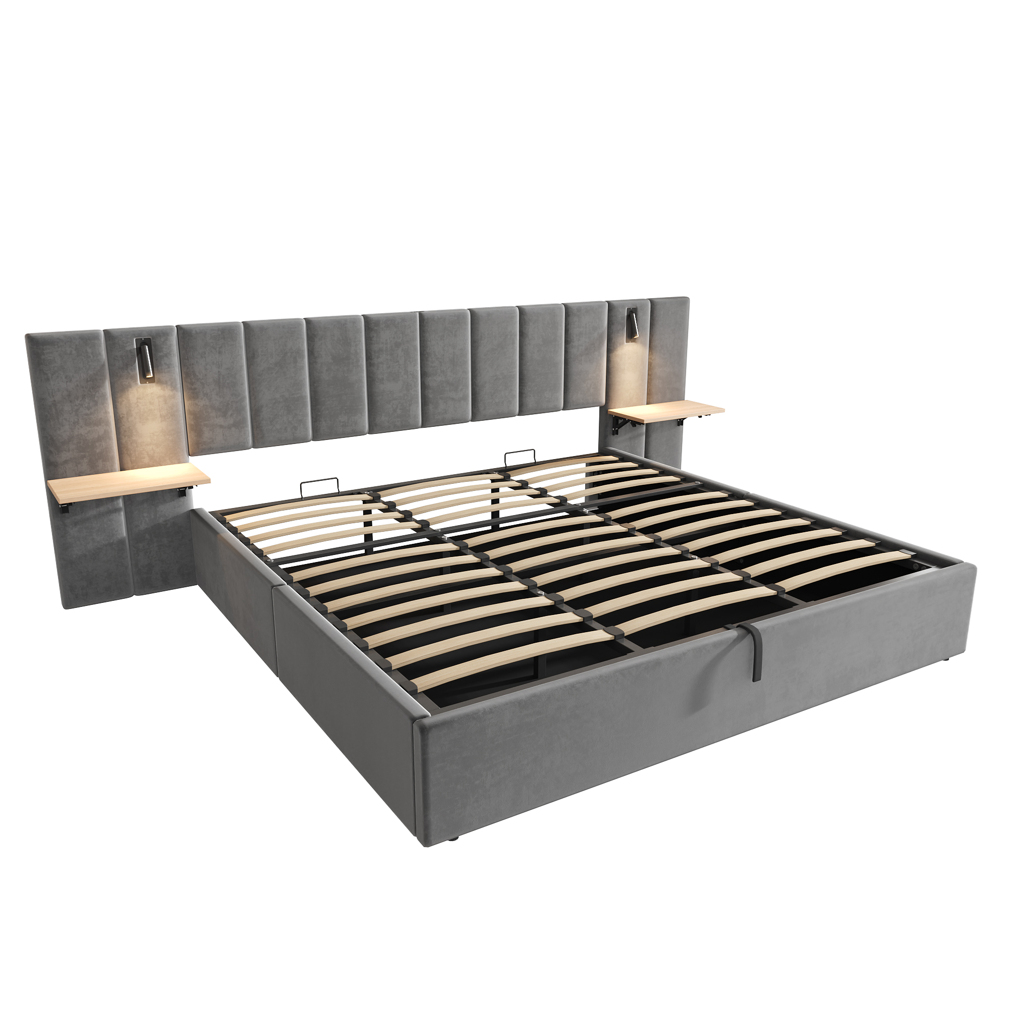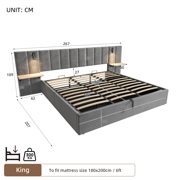 Product Name:Super King Upholstered Bed with Charging Station, Velvet Hydraulic Storage Bed with Reading Light, 6ft King Bed Frame with Channel Tufted Headboard and Adjustable Bedside Shelf, Grey (No Mattress)